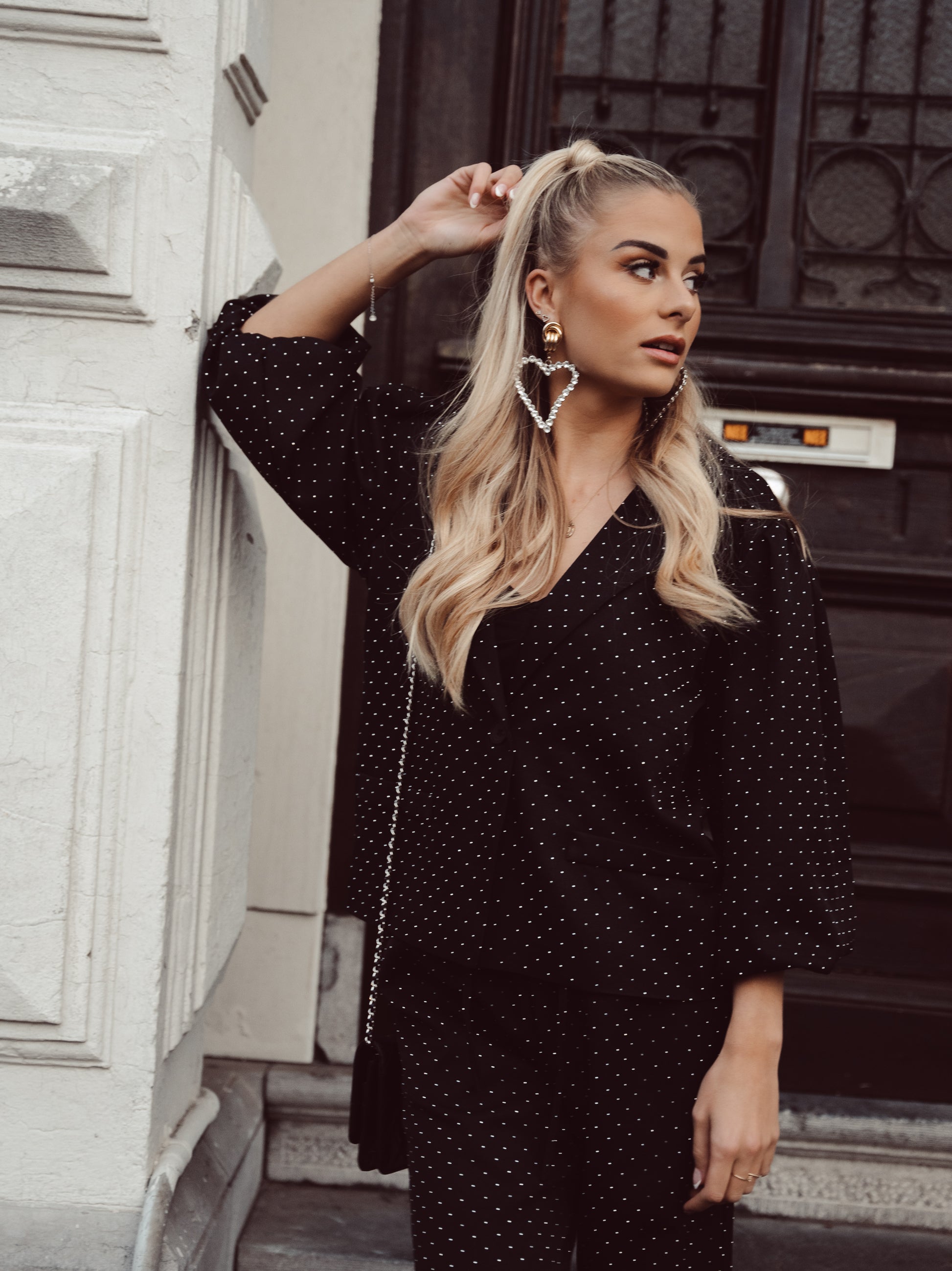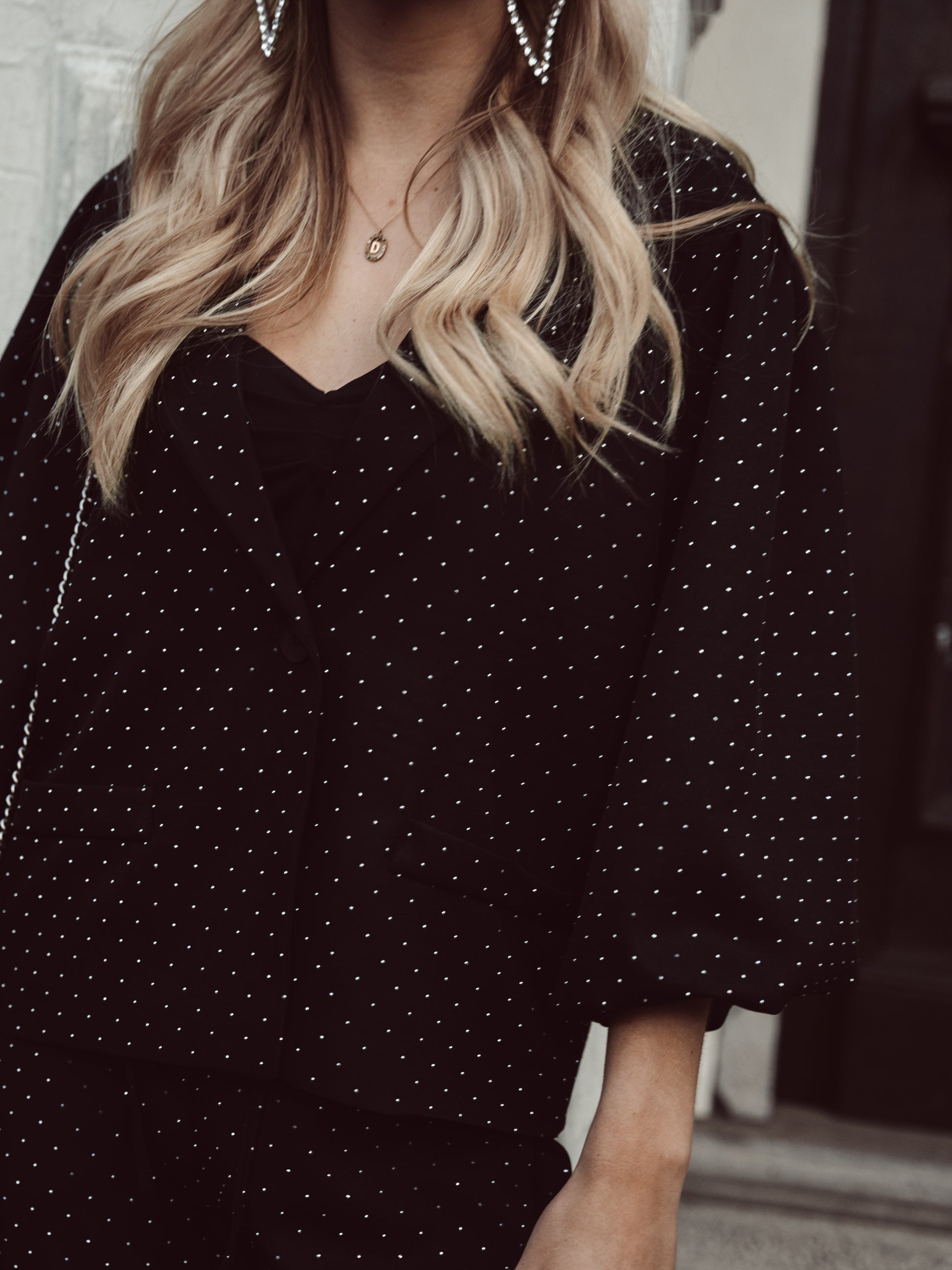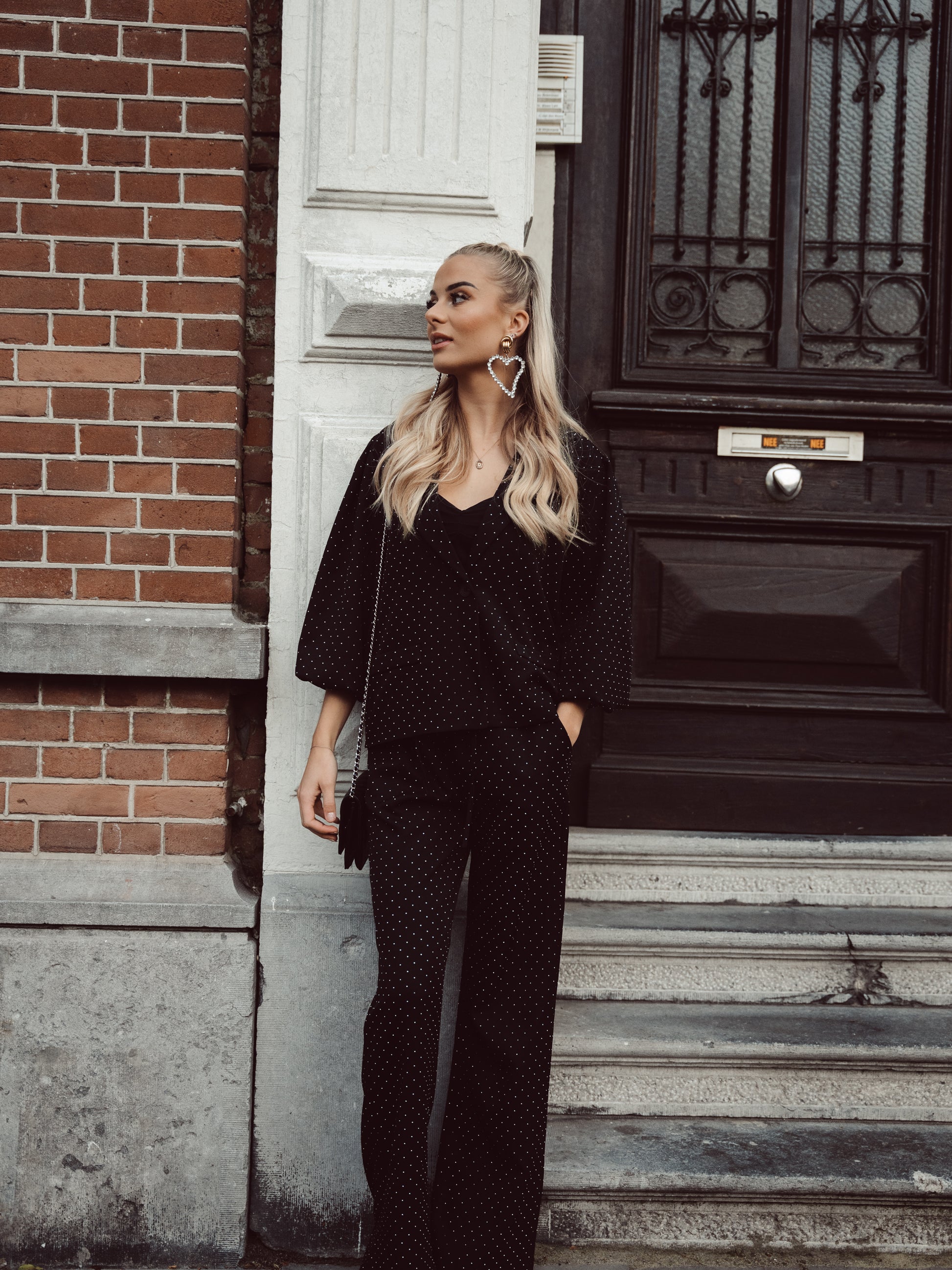 Dit geweldige jasje met strass steentjes heeft 3 kwart pofmouwen en een kraag. Het jasje sluit d.m.v. een knoop. Bijpassende broek Keli is ook verkrijgbaar in onze webshop voor een complete feest look.