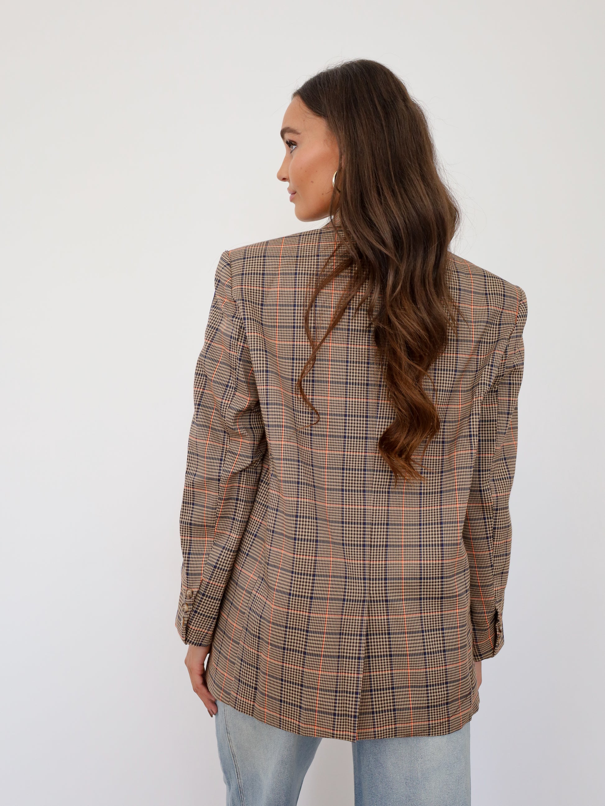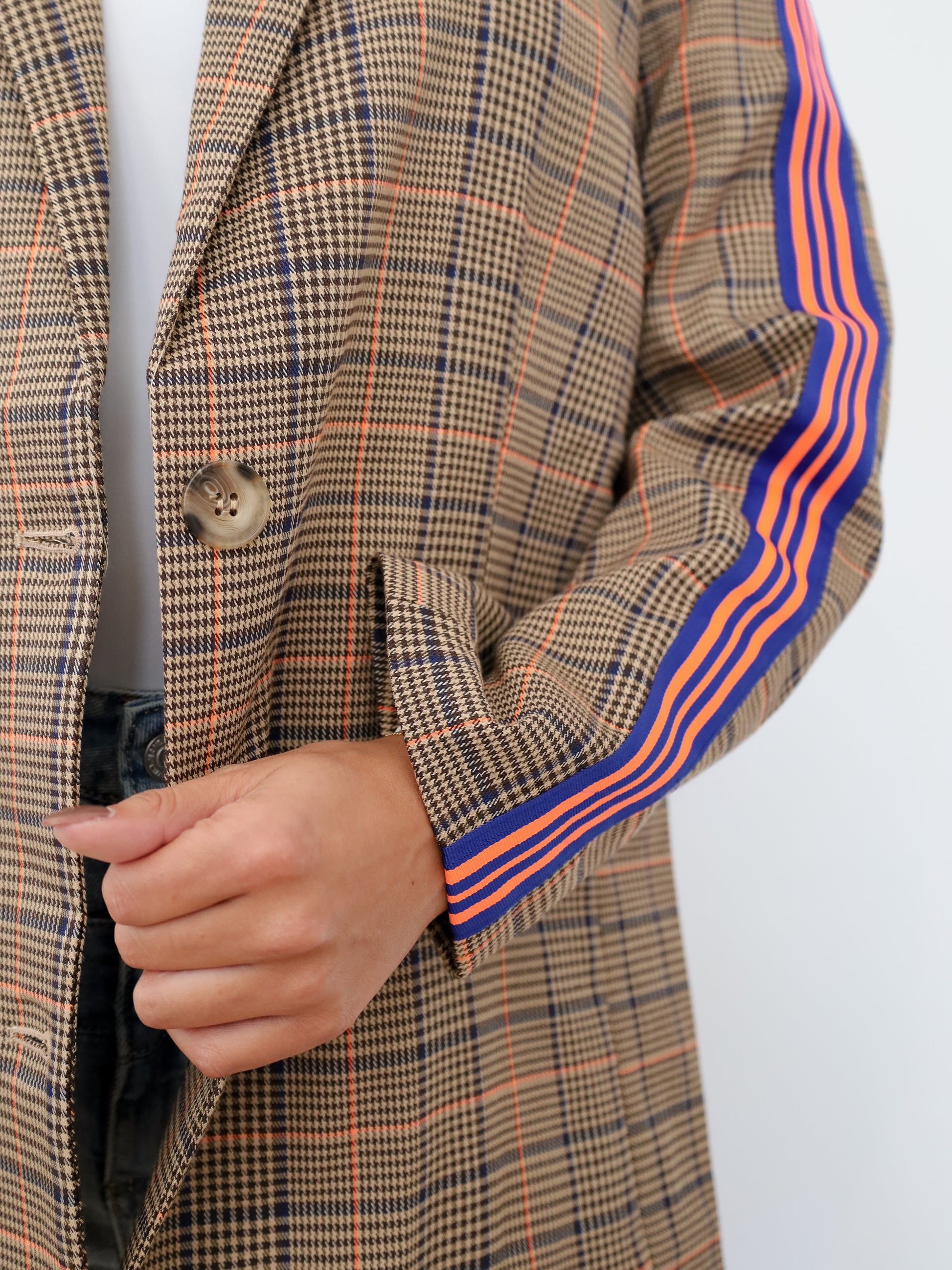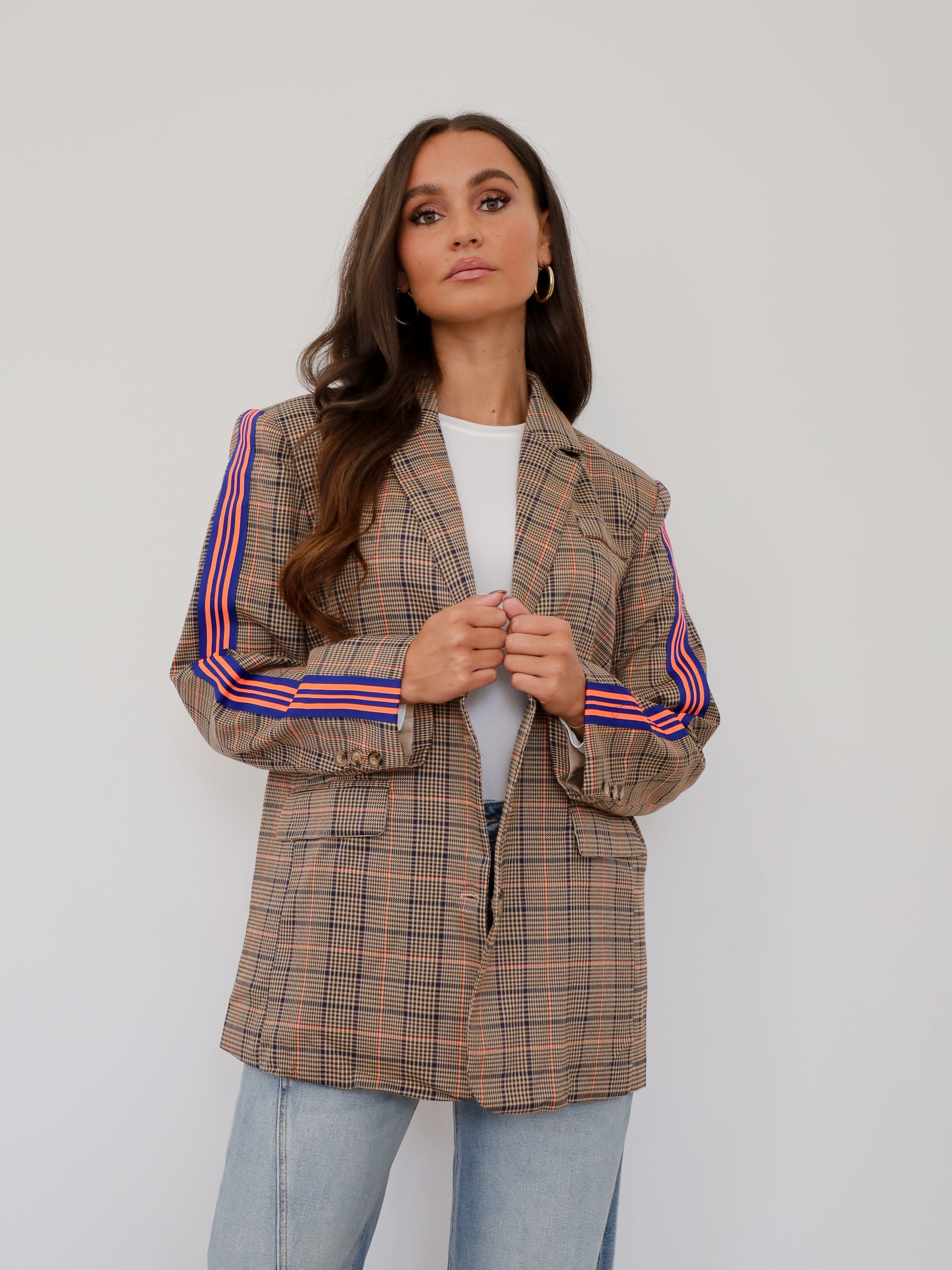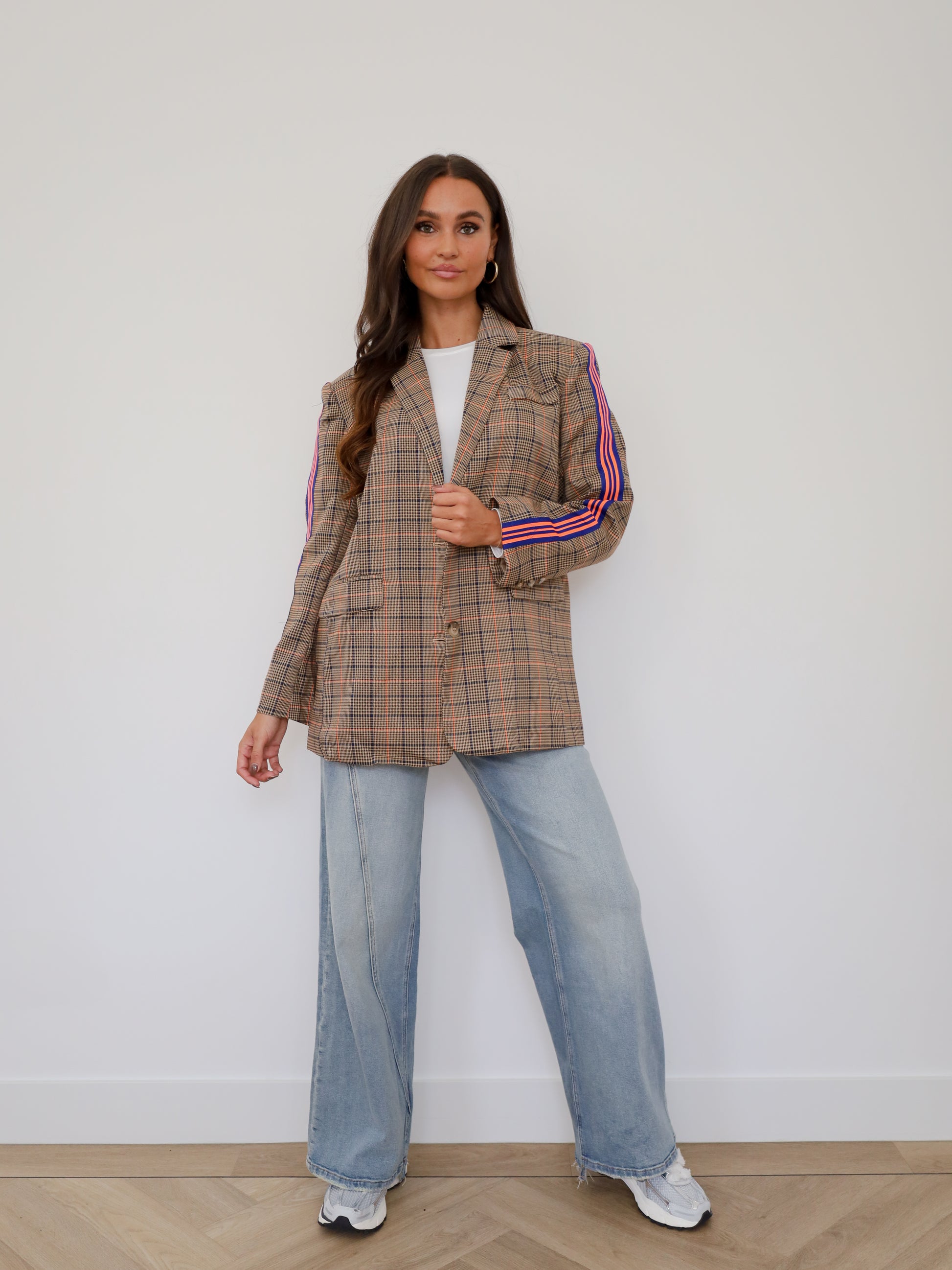 Deze blazer heeft een stijlvol ruitmotief en een sportieve roze streep aan de zijkant voor een trendy look. De blazer valt oversized.
