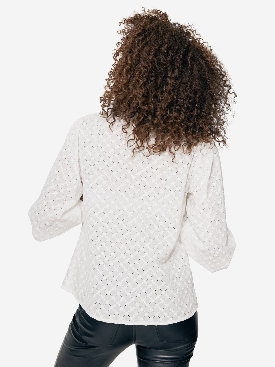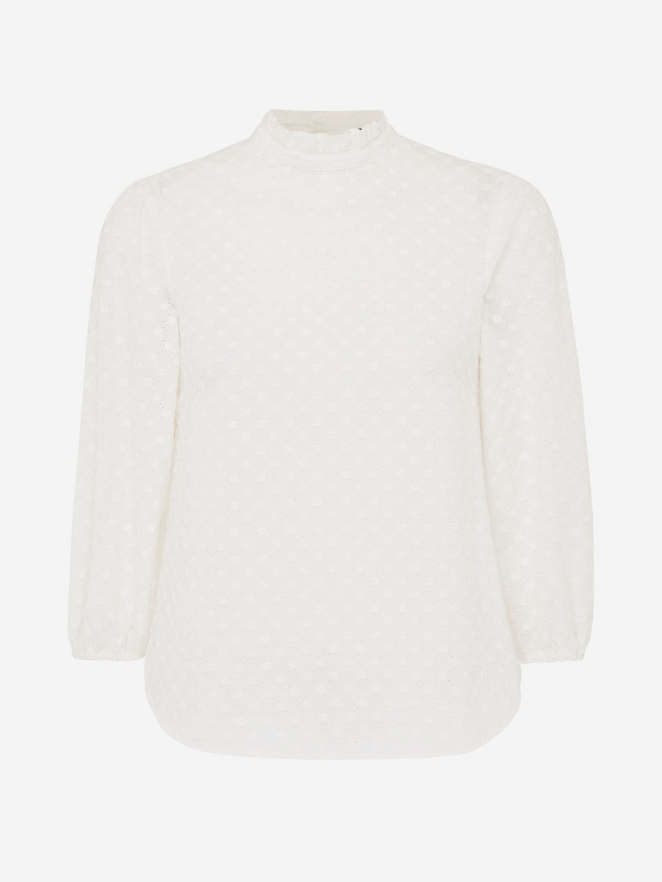 Broderie blouse. Mooi opstaand turtle nekje. Met lichte pof en kleine schoudervulling.