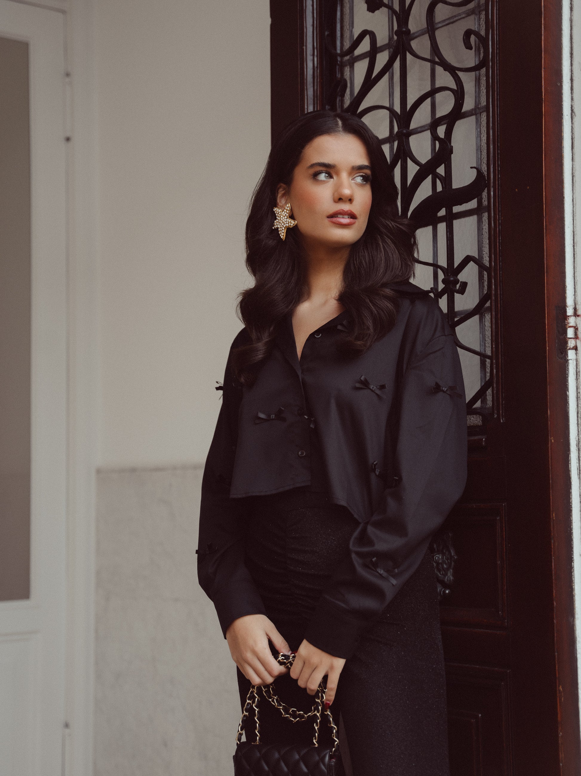 Wauw wij zijn fan van dit cropped blouse met strikjes. Leuk om te combineren met een glitter broek voor een feestelijke look of met een jeans voor een stoere look.