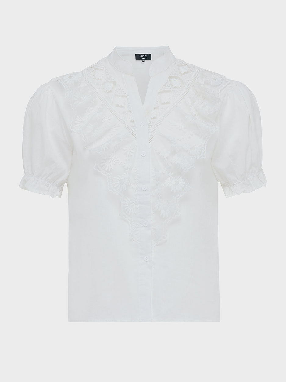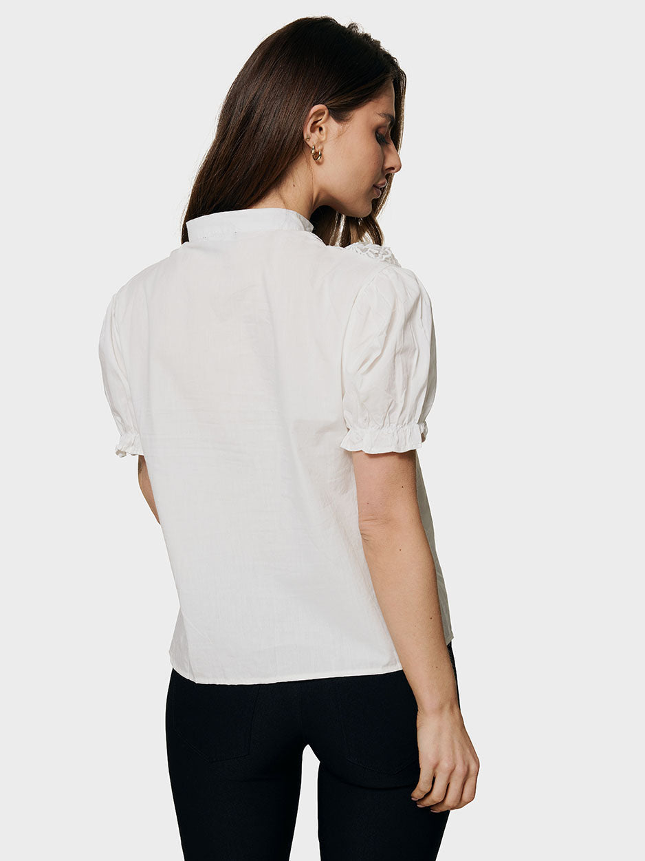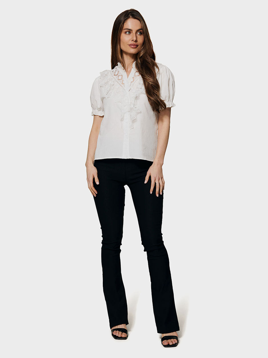 Blouse met v-hals, knoopsluiting en kant aan de voorkant. De blouse heeft korte mouwen met een elastiek aan de onderkant.