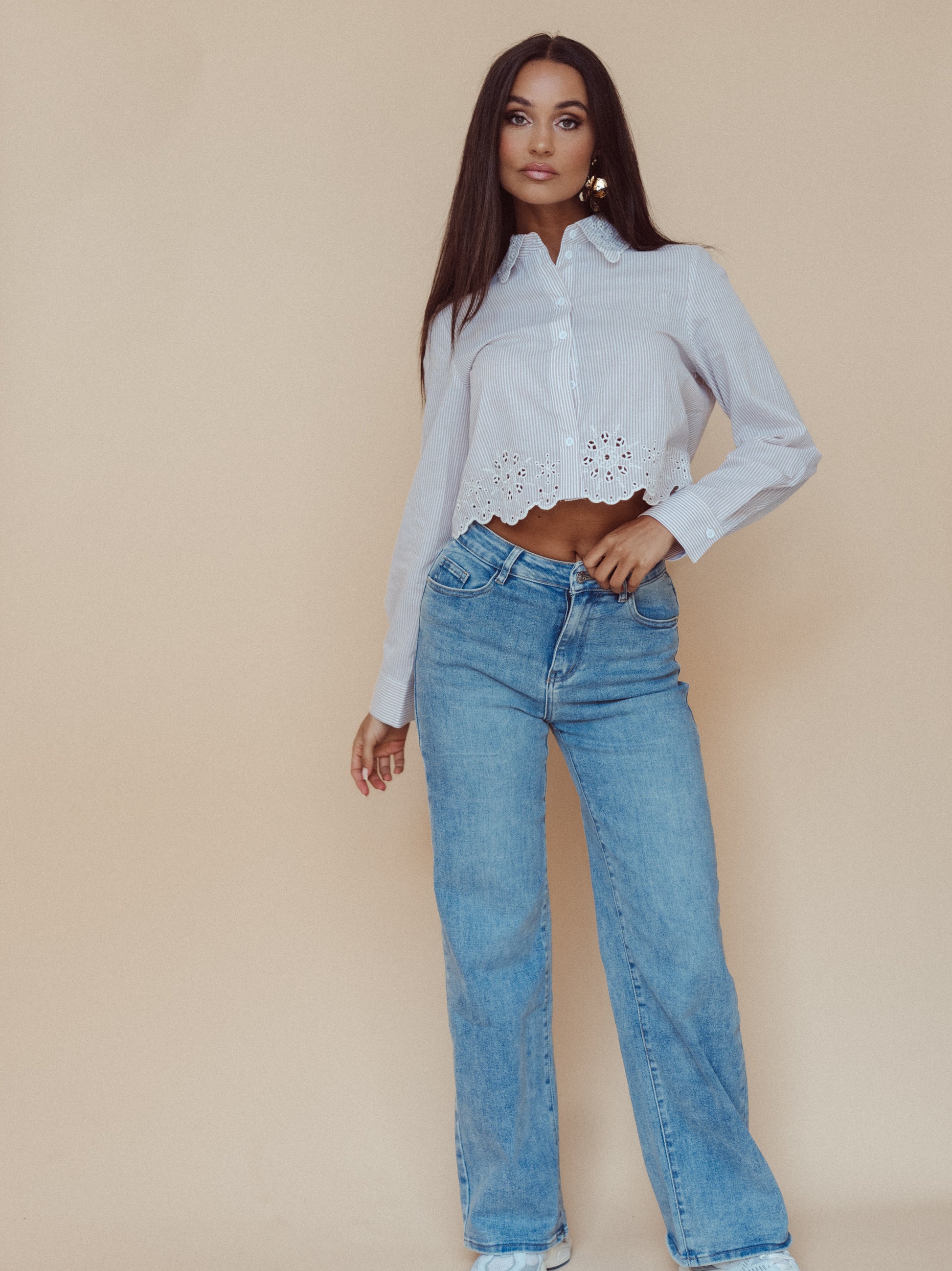 Deze mooie gestreepte blouse Jill in beige heeft een cropped model en is versierd met broderie-details aan de onderkant en op de kraag. Een elegante en speelse toevoeging aan je garderobe voor een casual, maar verfijnde look.