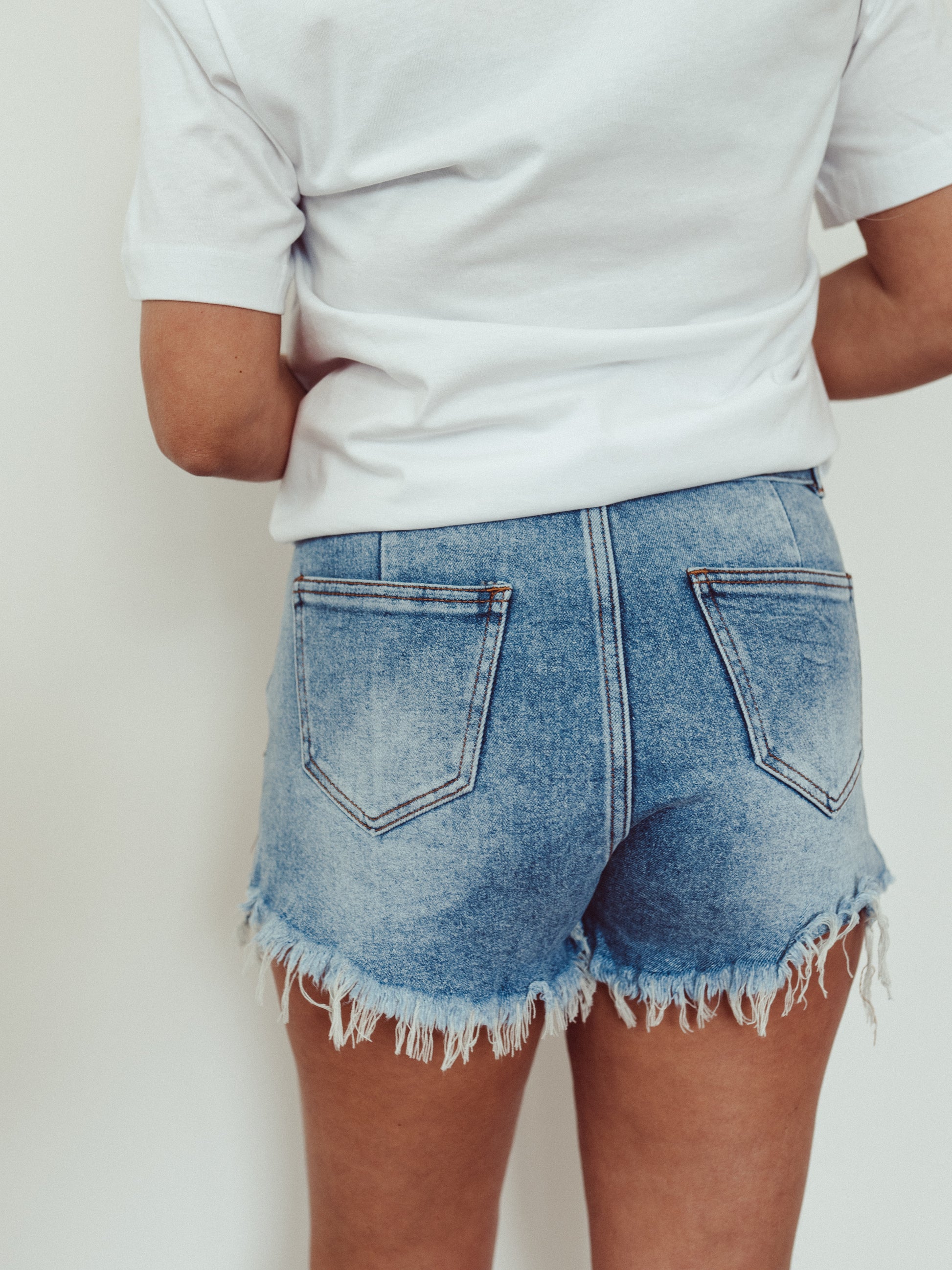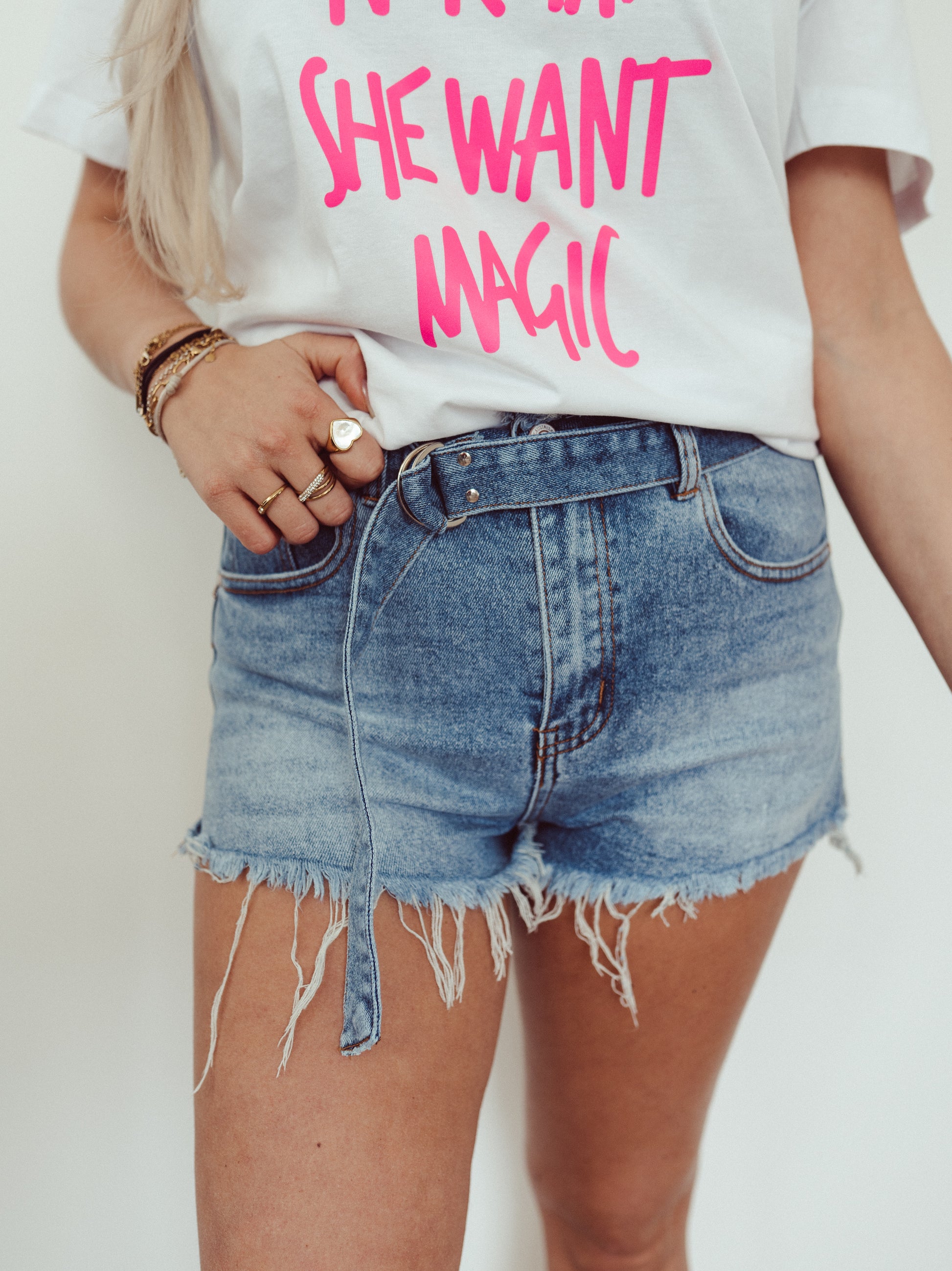 Denim shortje met riempje. Dit shortje zit echt mega lekker omdat dit shortje veel stretch bevat.