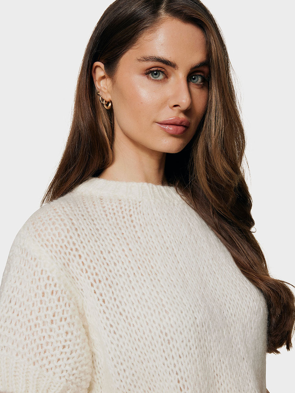 Een grof gebreide top met een extra zachte touch, een ronde hals en korte ballonmouwen.