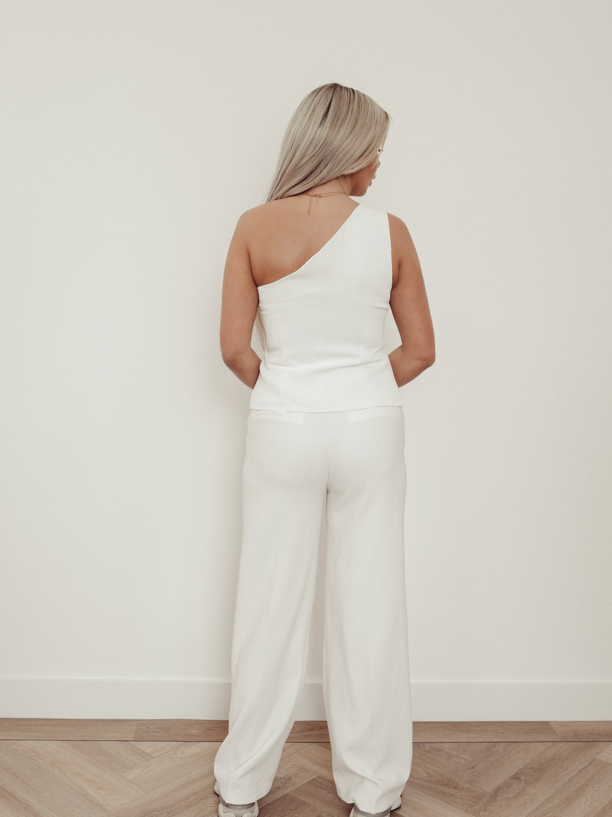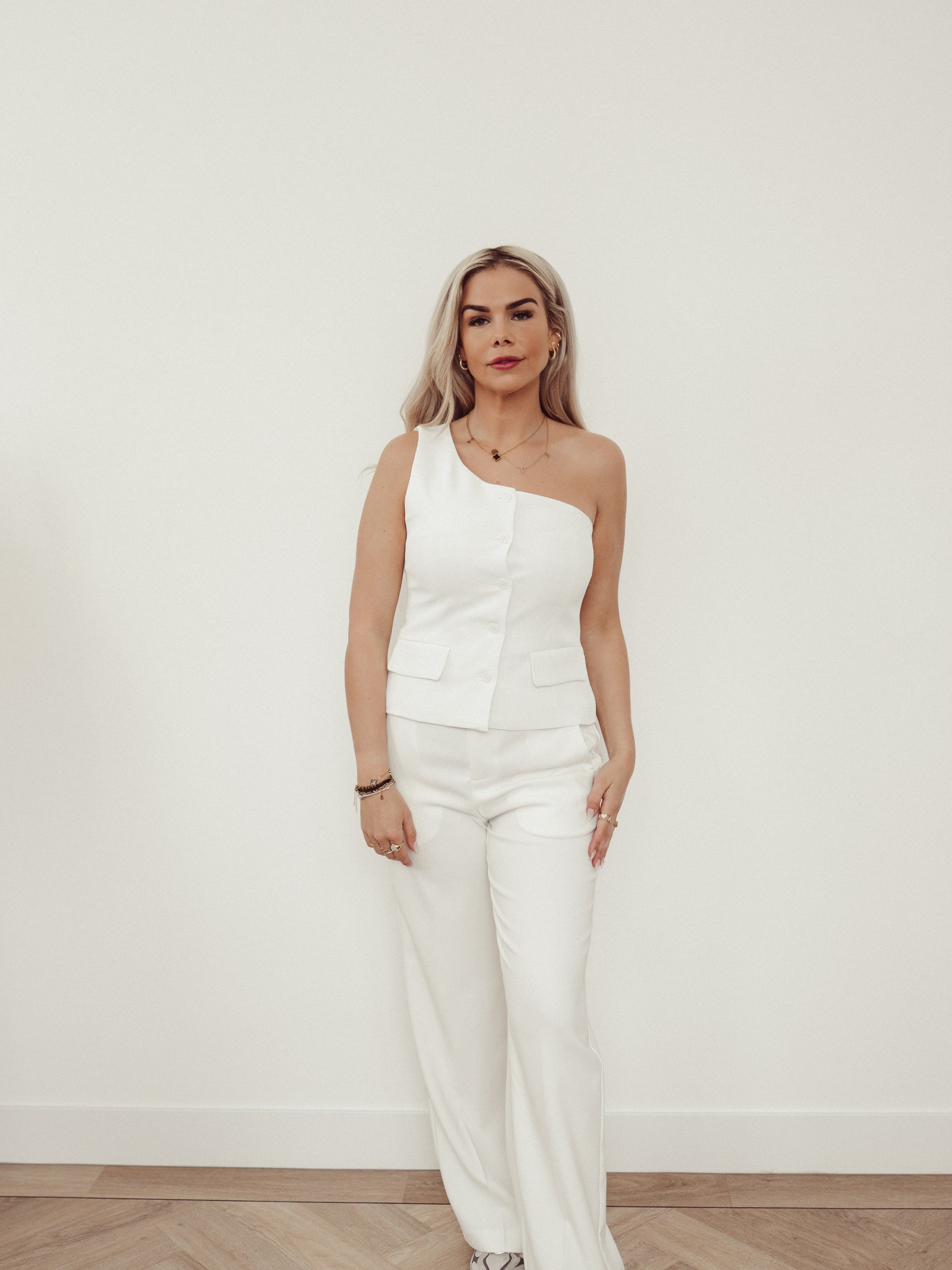 Check onze absolute favoriet: de one-shoulder gilet! Perfect te combineren met onze witte wide leg trouser. Gegarandeerd een stijlvolle look!