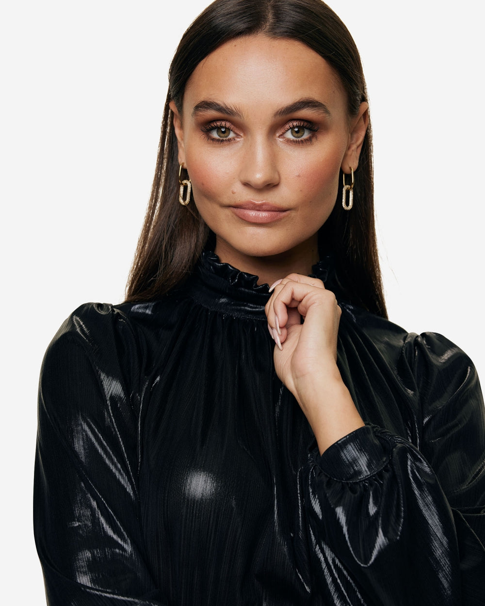 Jurkje met glossy coating zorgt voor een stoere maar vrouwelijke touch. De ceintuur zit vast aan de achterzijde en zorgt voor een speels effect. Een échte musthave voor de feestdagen!