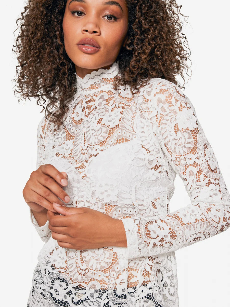 Deze prachtige kanten top heeft een vrouwelijke touch dankzij de rechtopstaande hals en licht klokkende zoom. De top heeft lange mouwen en coupenaden op de voorkant.