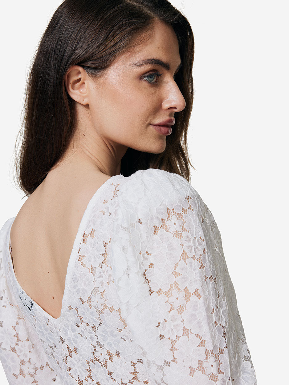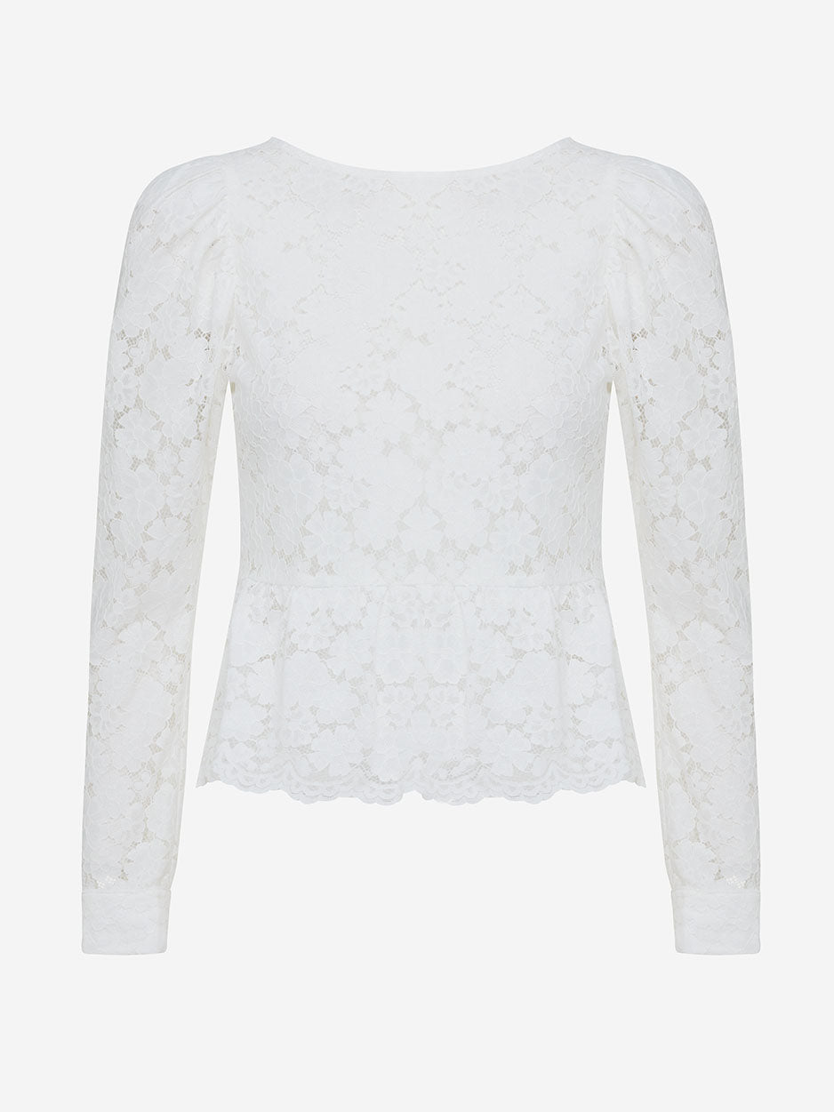 Deze prachtige kanten top heeft een vrouwelijke touch dankzij de pofmouwen en v-hals aan de achterkant. De top heeft lange mouwen met een HER knoopje aan het eind.