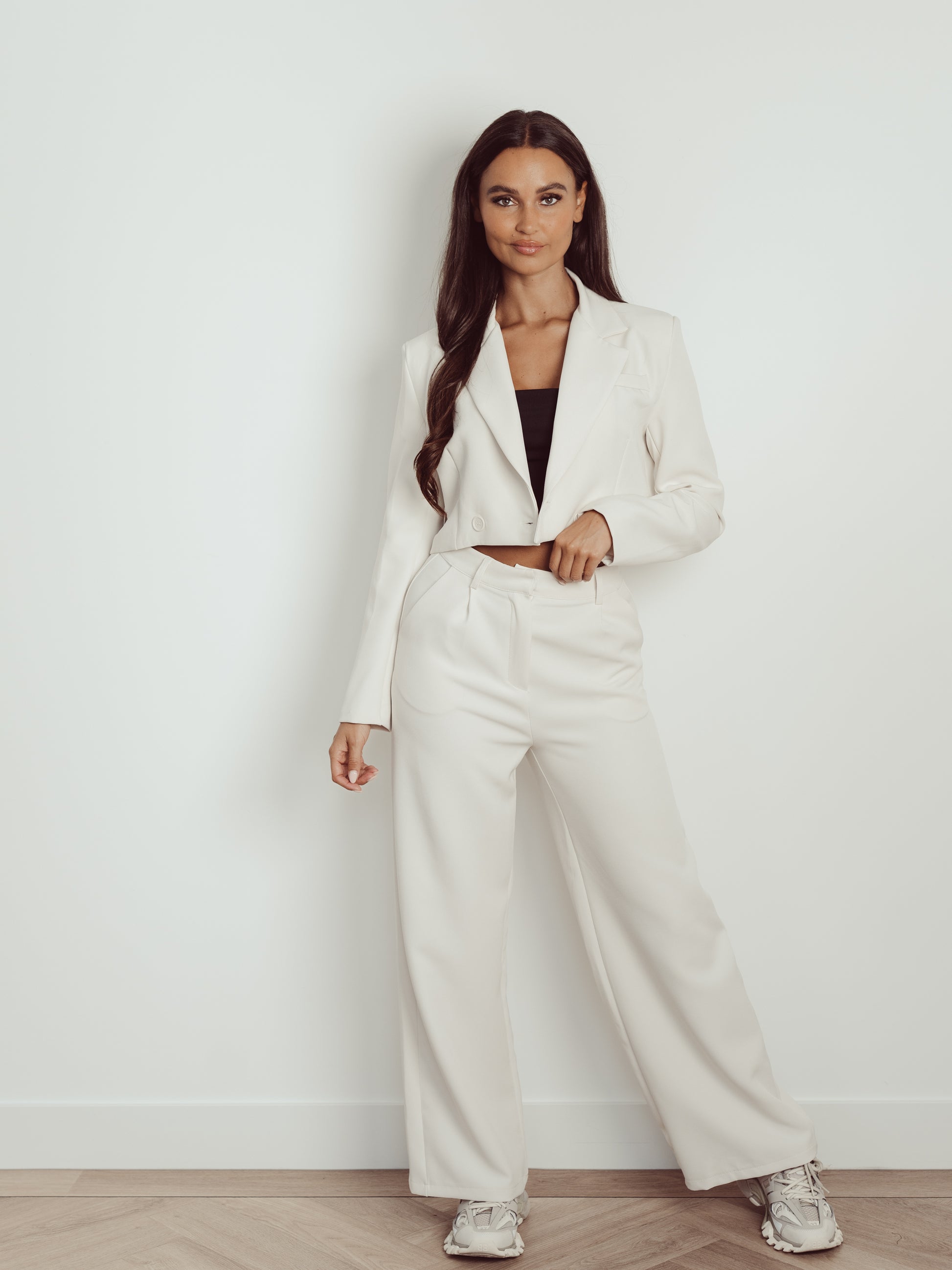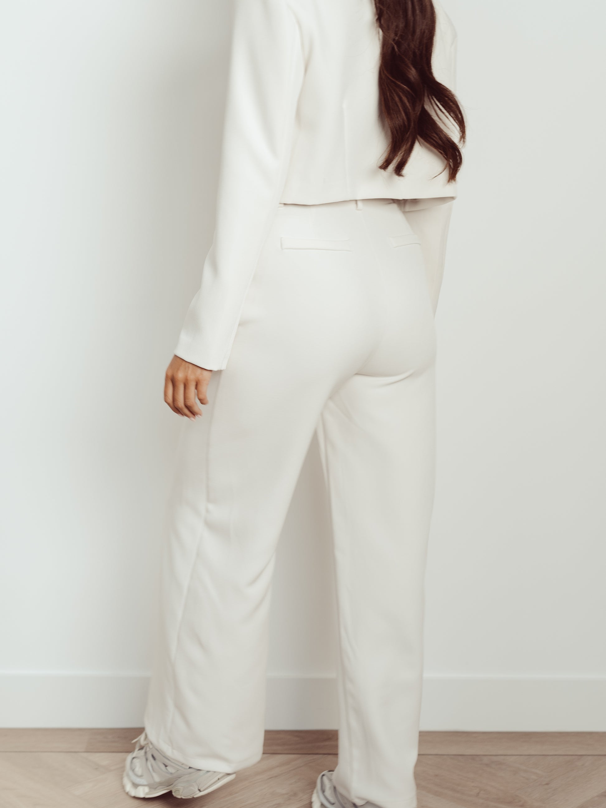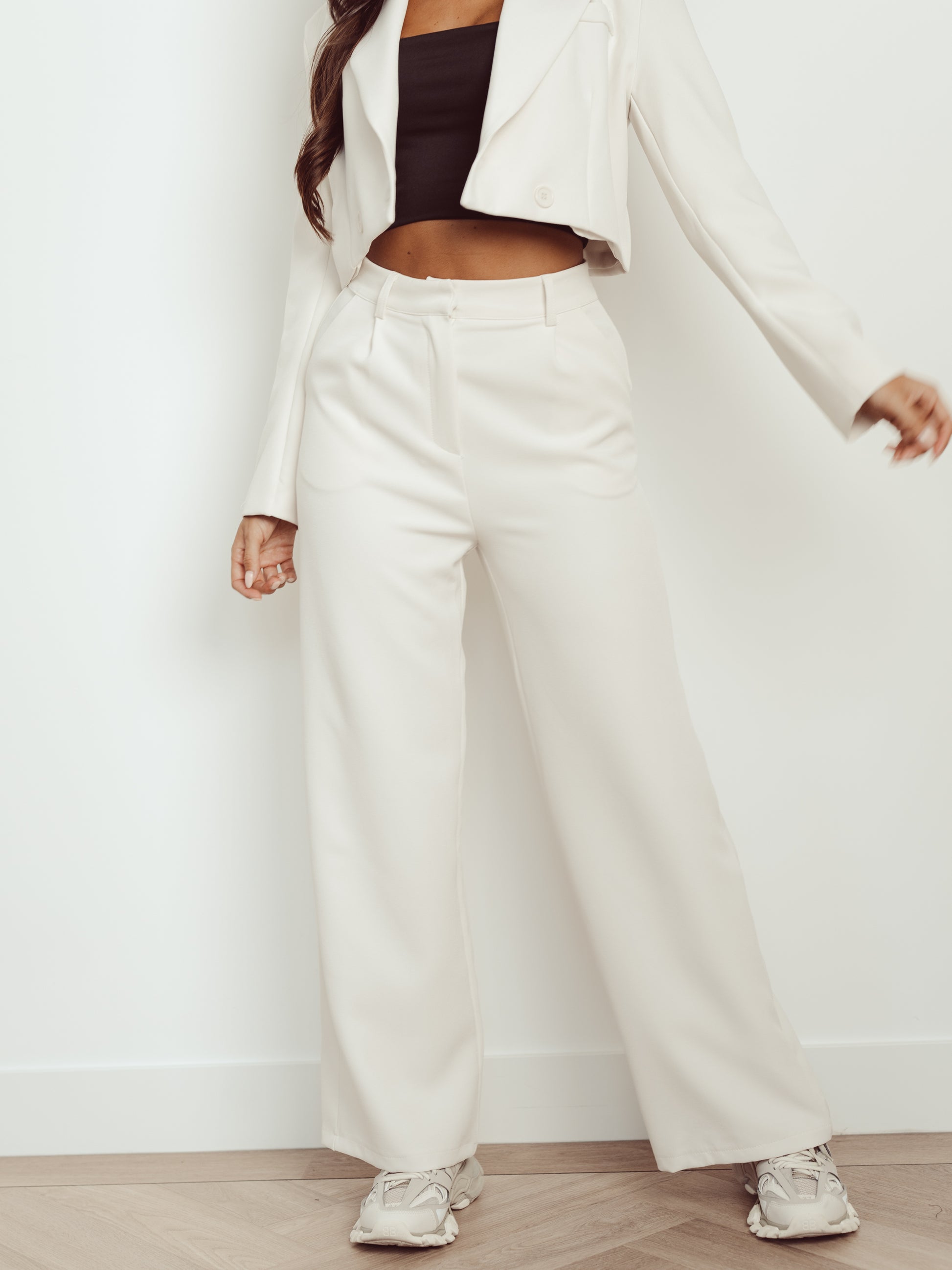 Pantalon van super mooie stof met wij uitlopende pijpen. De broek heeft steekzakken en riemlussen. Combineer hem met de bijpassende cropped blazer.