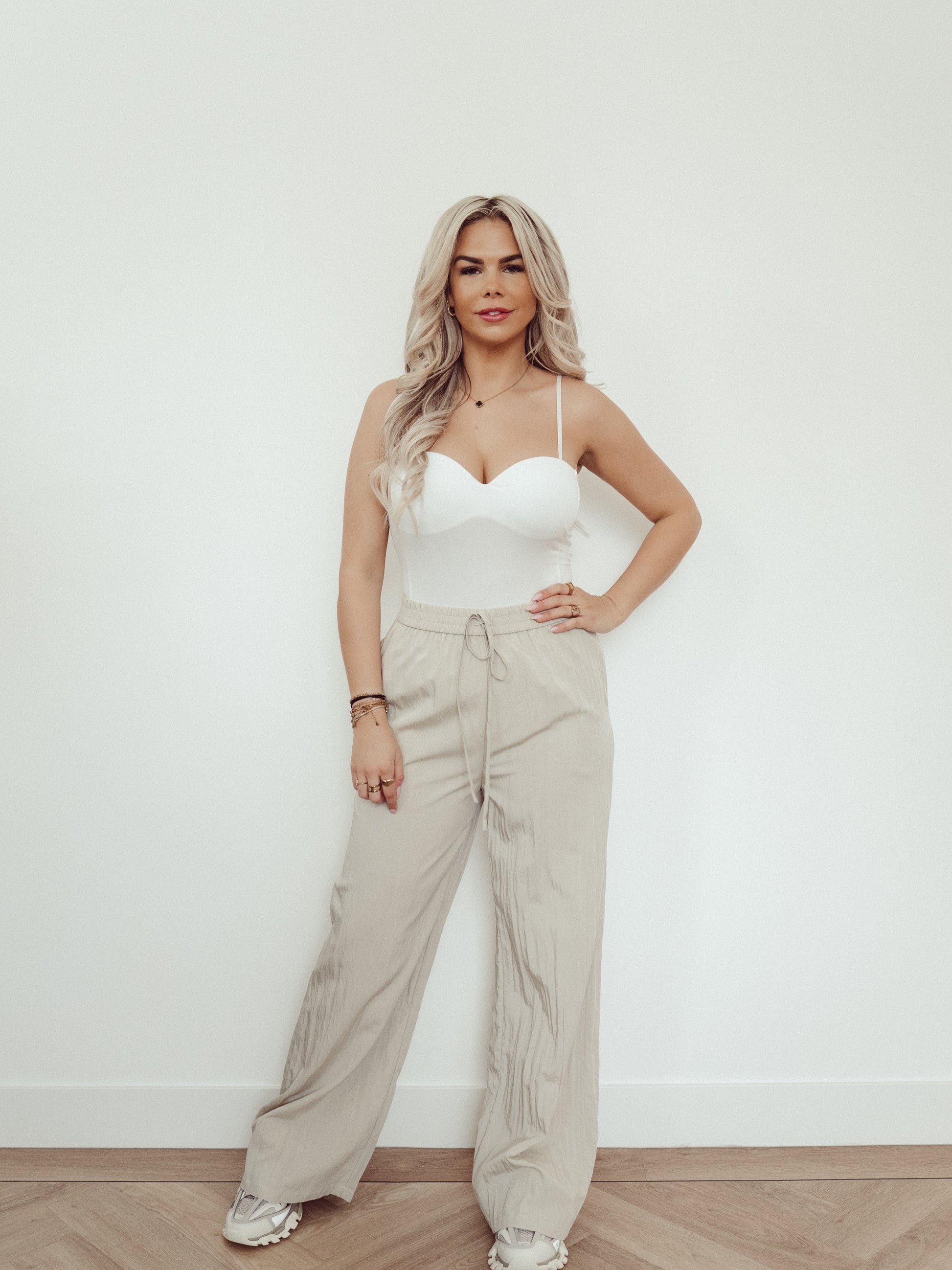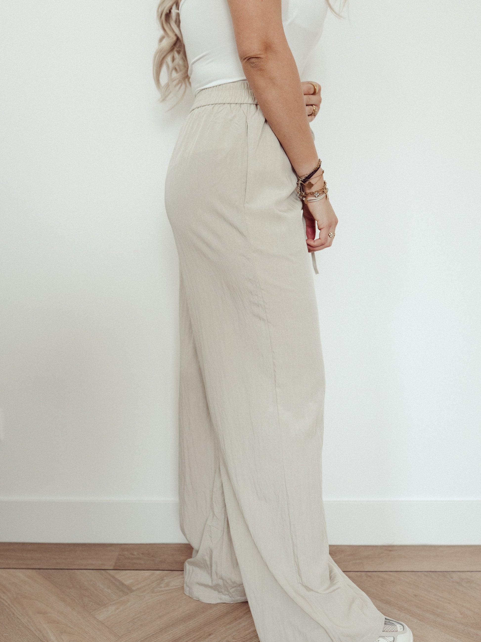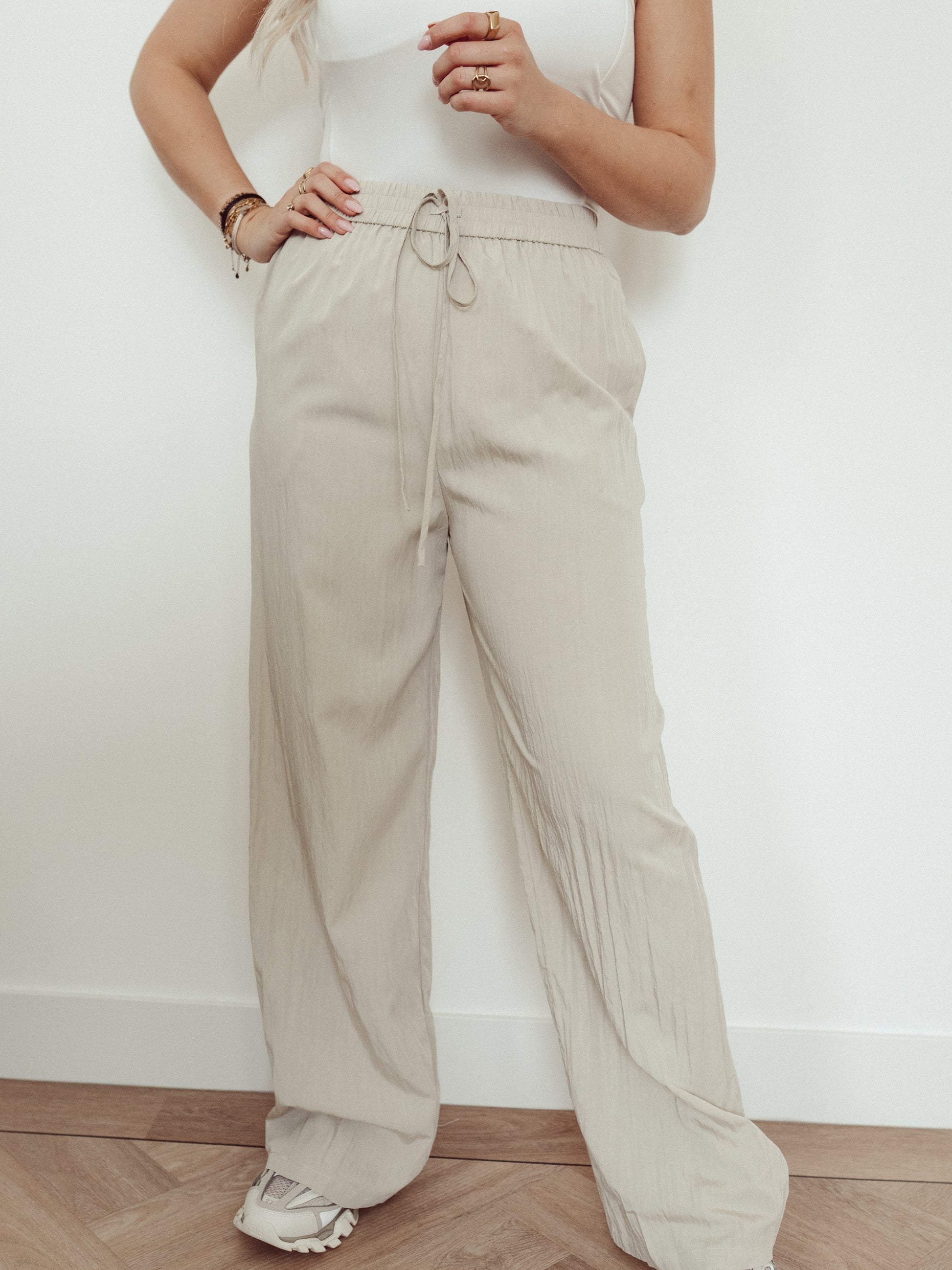 Pantalon van een fijn stofje met een aantrek koord. Leuk om te combineren met een body.