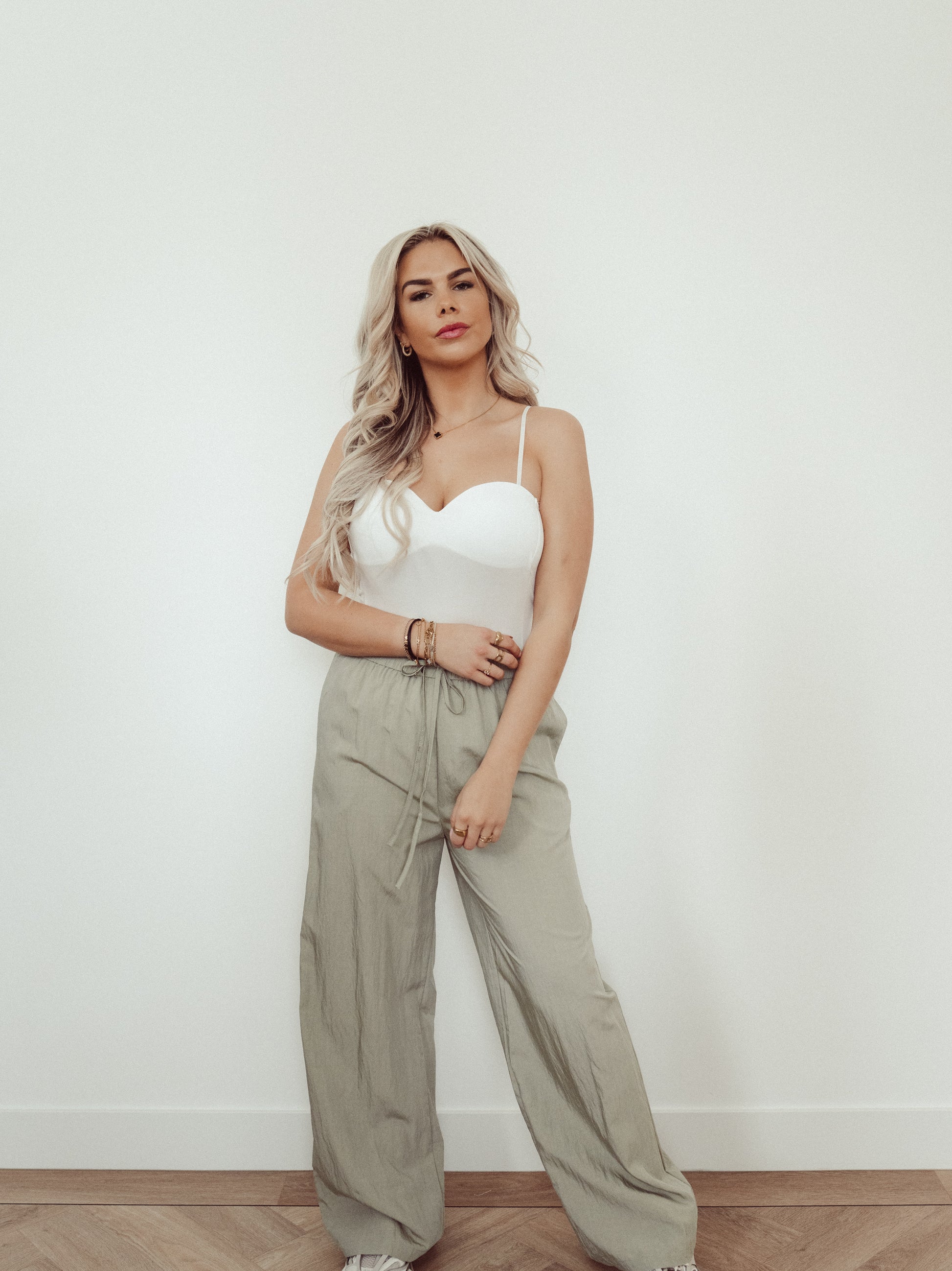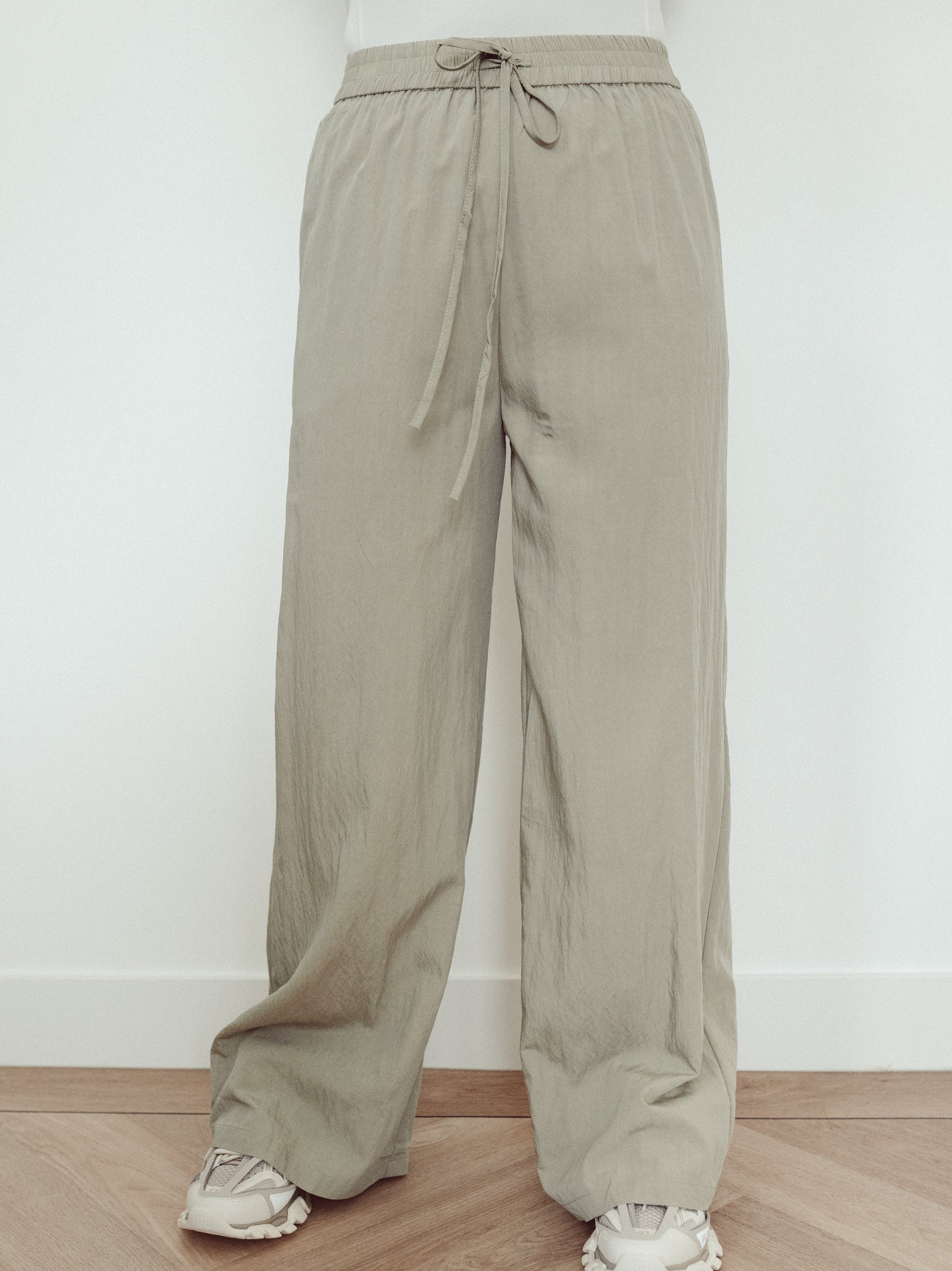 Pantalon van een fijn stofje met een aantrek koord. Leuk om te combineren met een body.