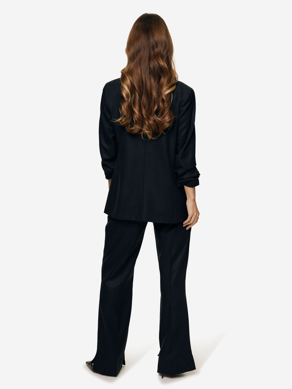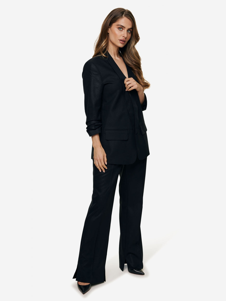 Tijdloze, chique, wijd uitlopende pantalon met split gecombineerd met de ROBIN FOILED BLAZER.