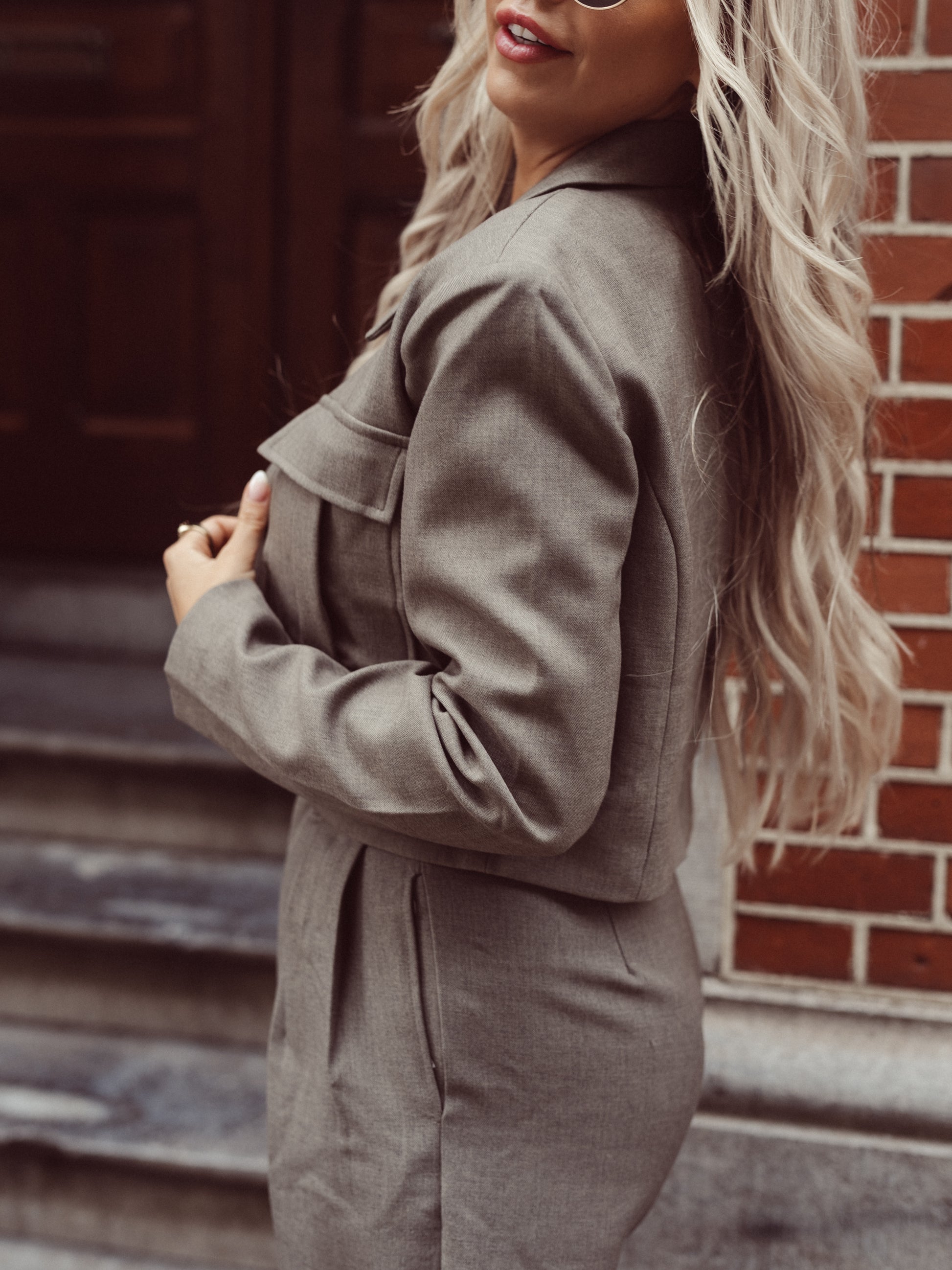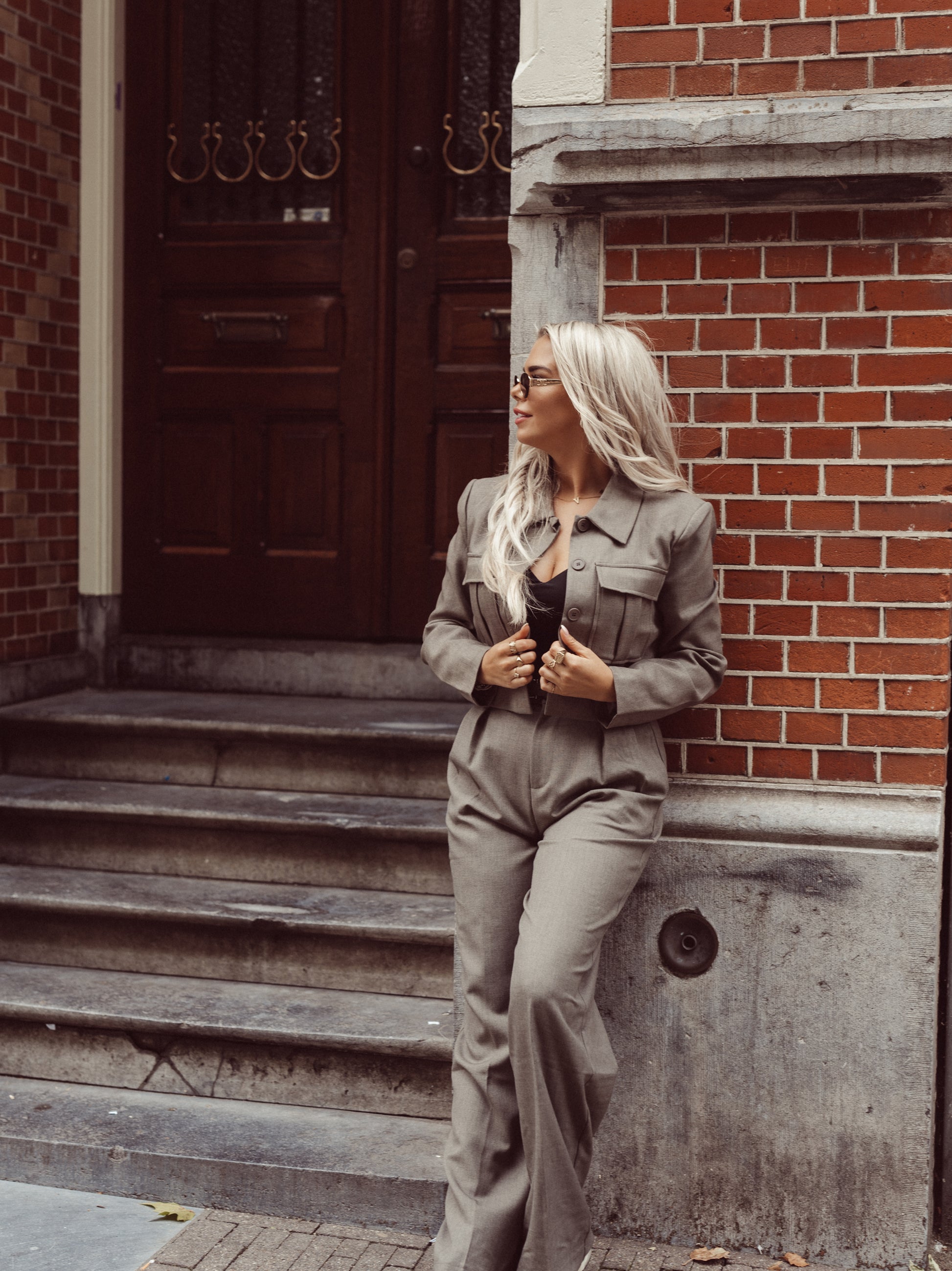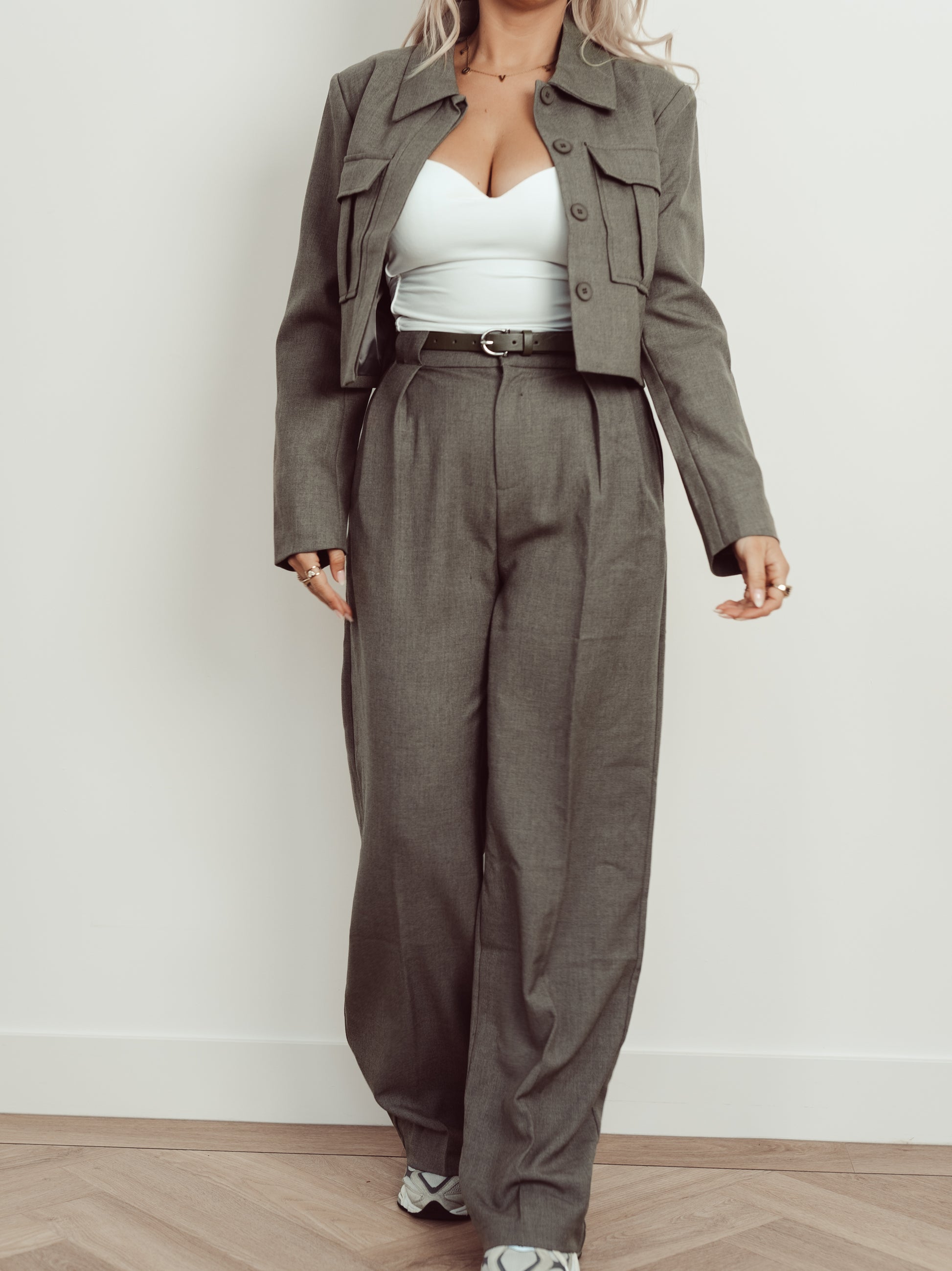 Musthave set! Hoe mooi is deze 2 delige set? De set bestaat uit een pantalon met steekzakken en is afgewerkt met een riempje. Het jasje heeft stoere zakken op de voorzijde. De set valt op maat.