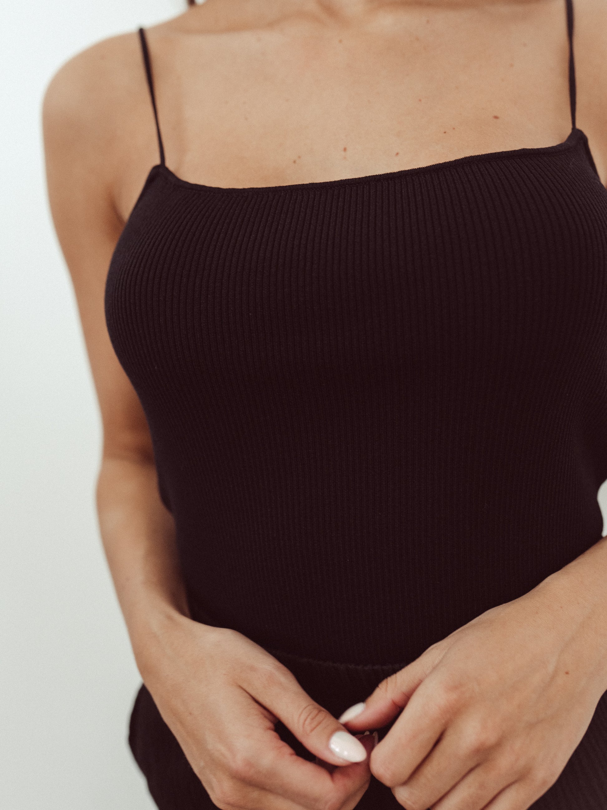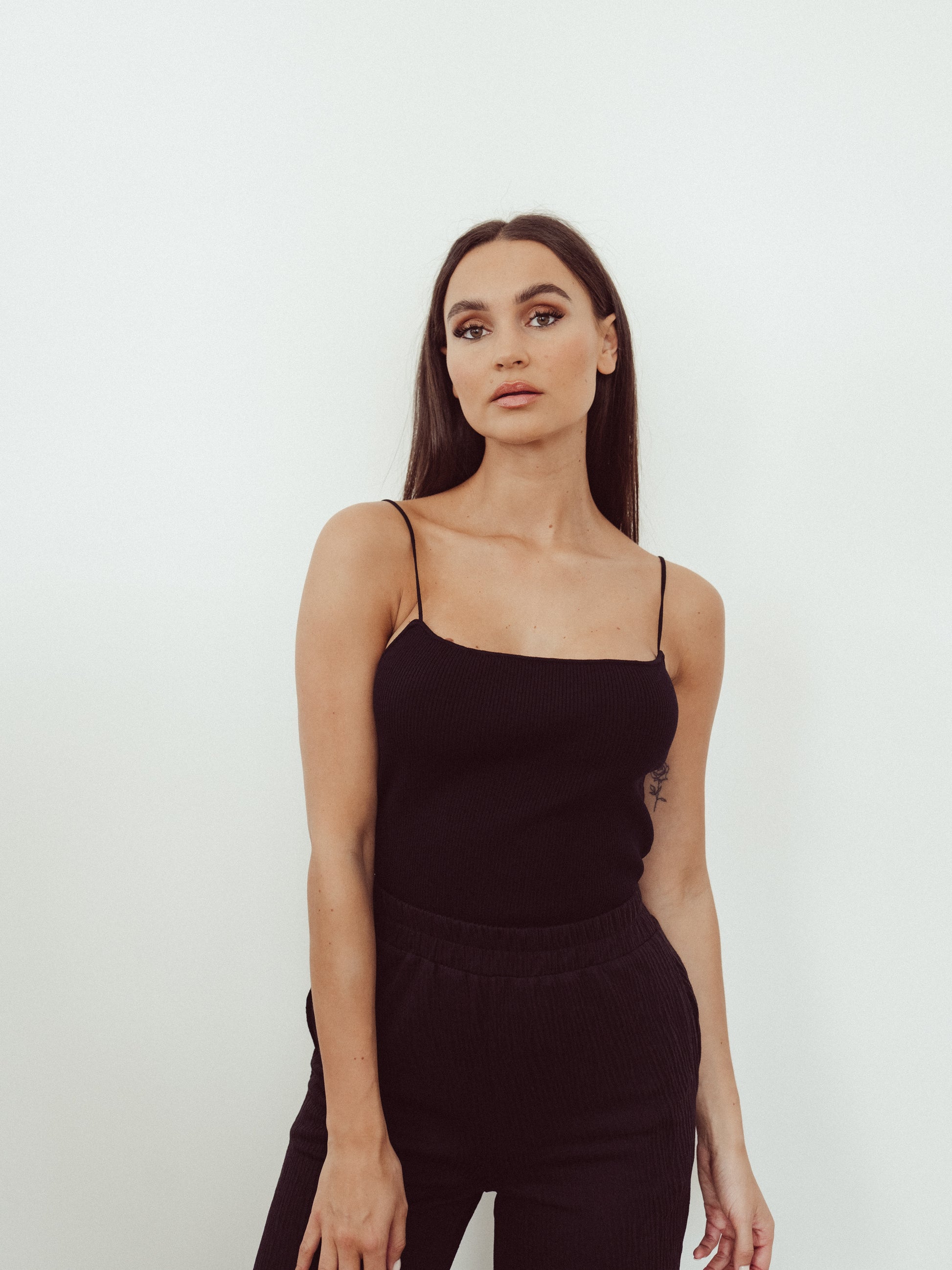 Ribbed topje, verkrijgbaar in het zwart en beige van een super zachte staf. Bijpassende broek verkrijgbaar.