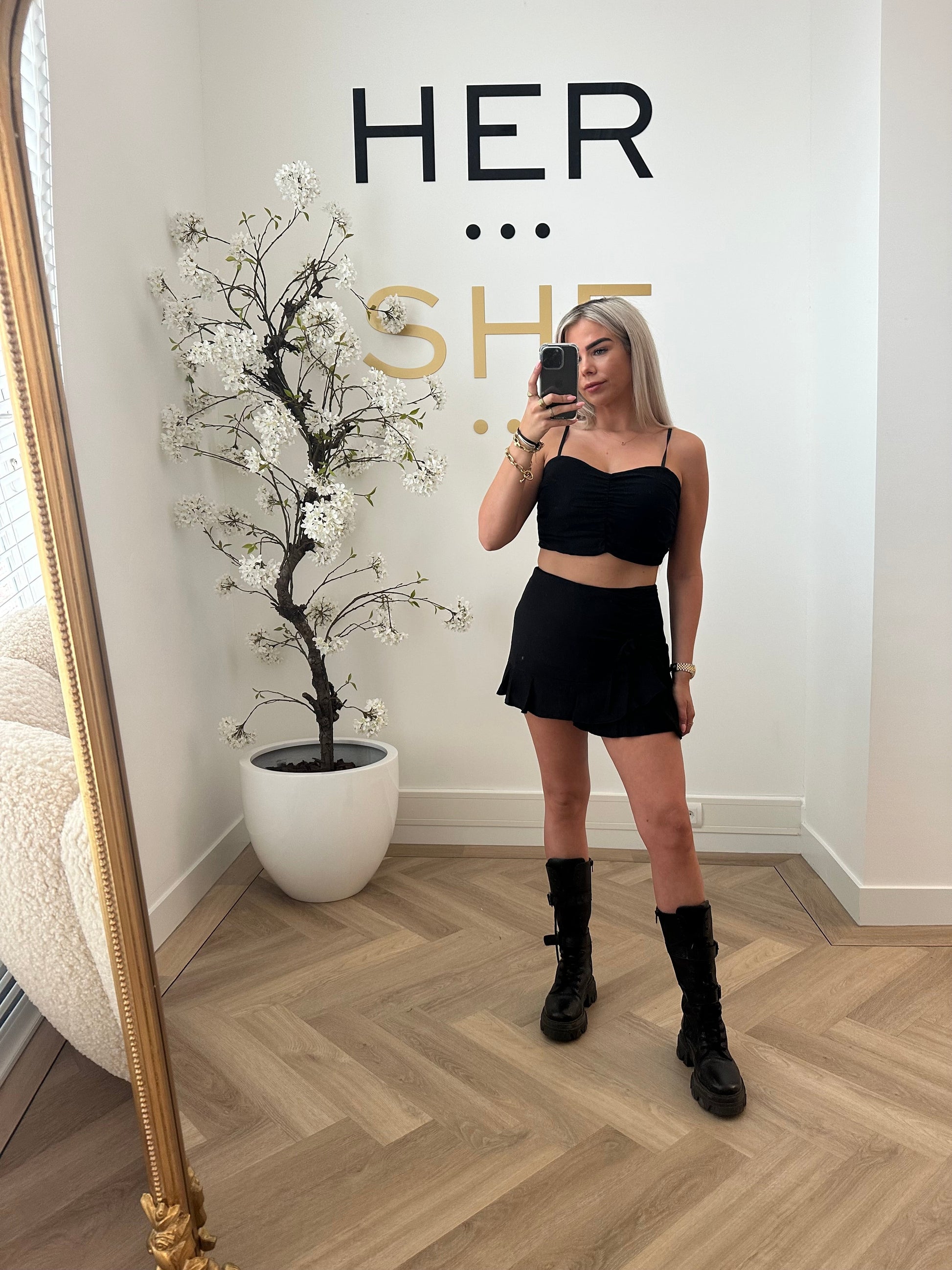 Twee delig setje met een broek rokje en een topje in de kleur zwart