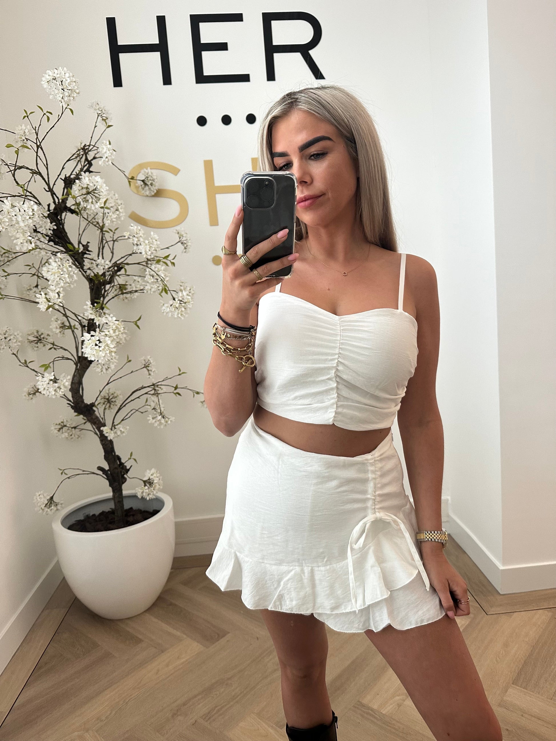 Twee delig setje met een broek rokje en een topje in de kleur wit