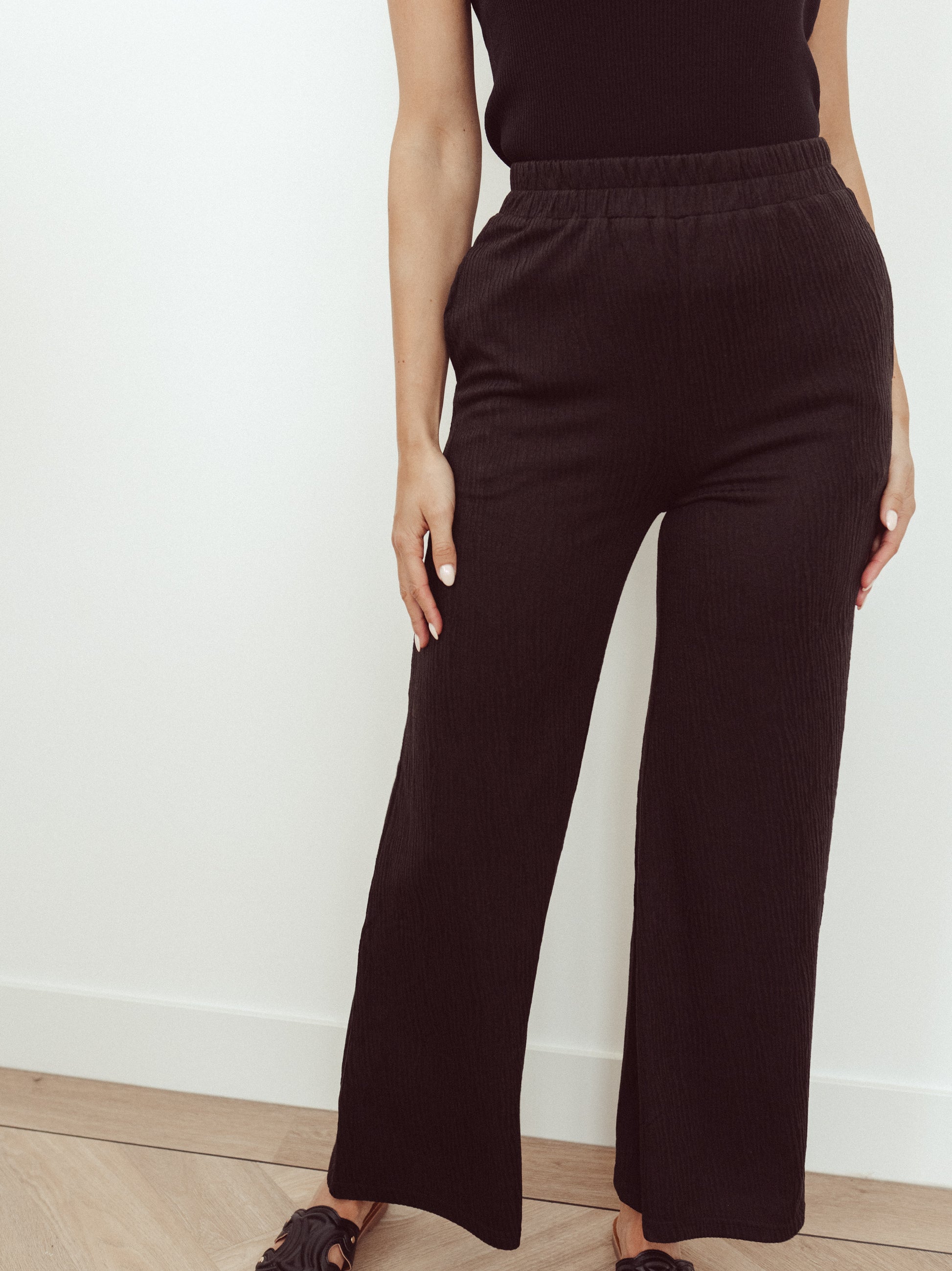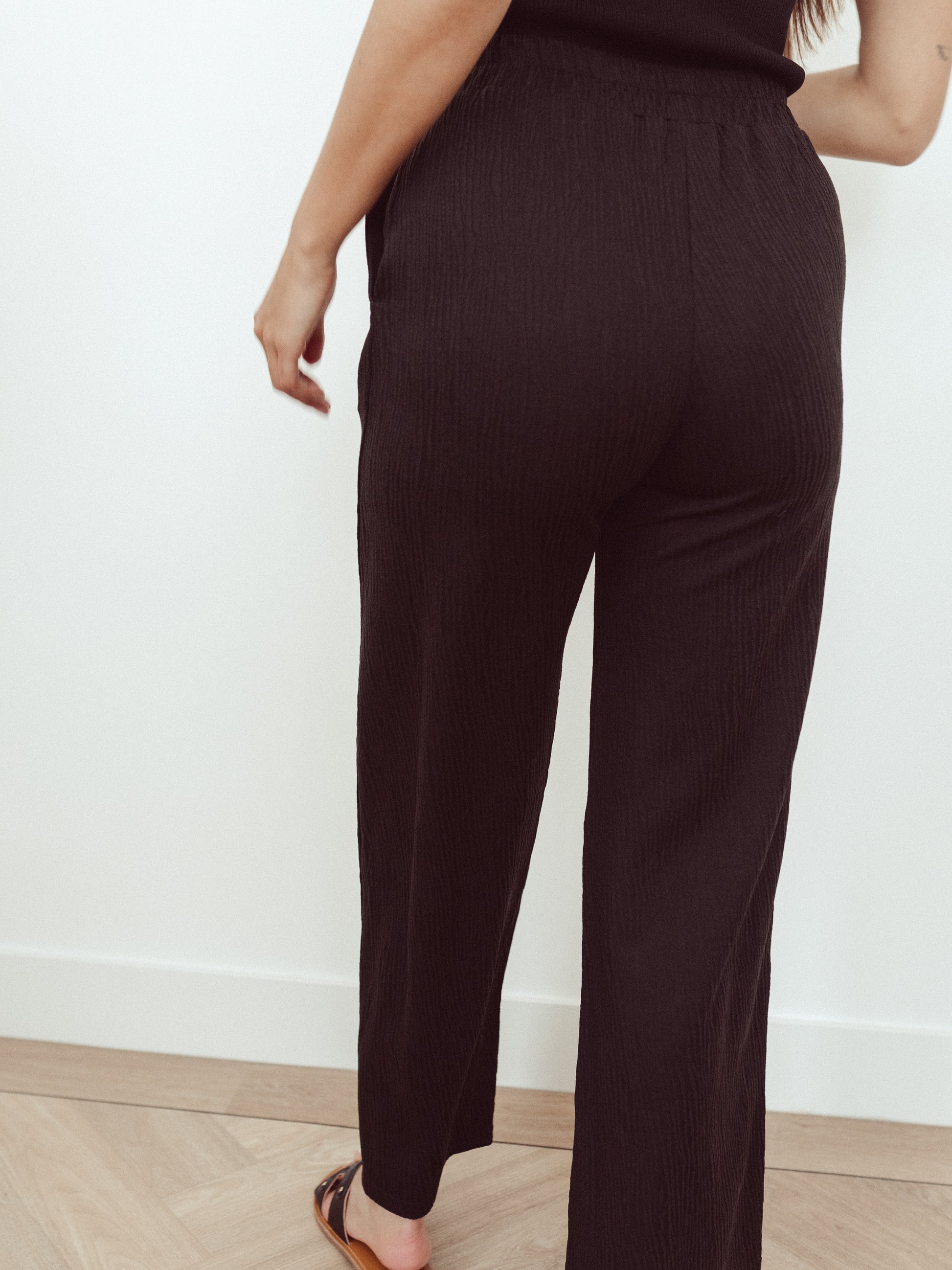 Wide leg pants met textuur, verkrijgbaar in het zwart en beige. Deze broek zit echt mega comfy en bijpassend topje verkrijgbaar.