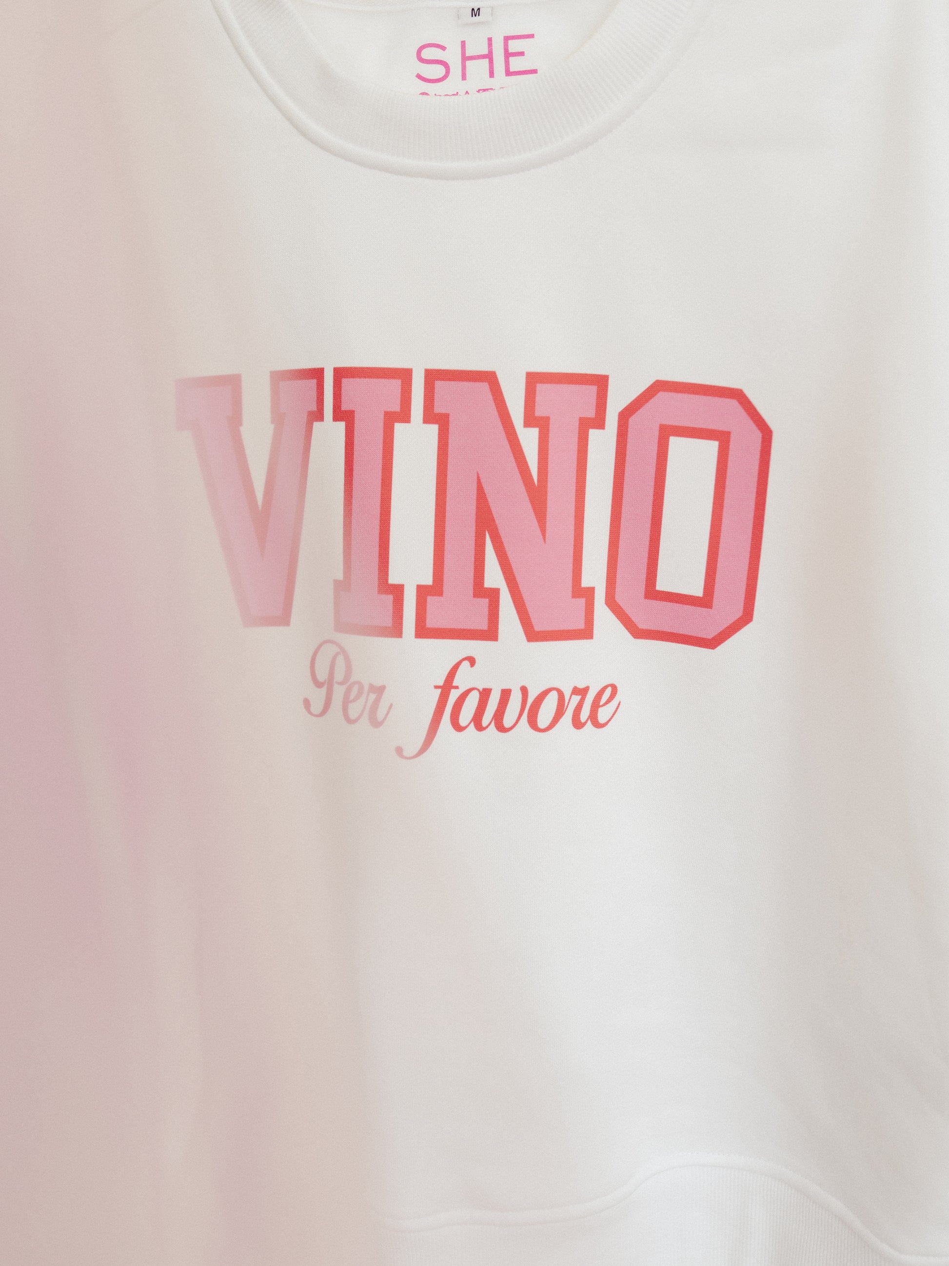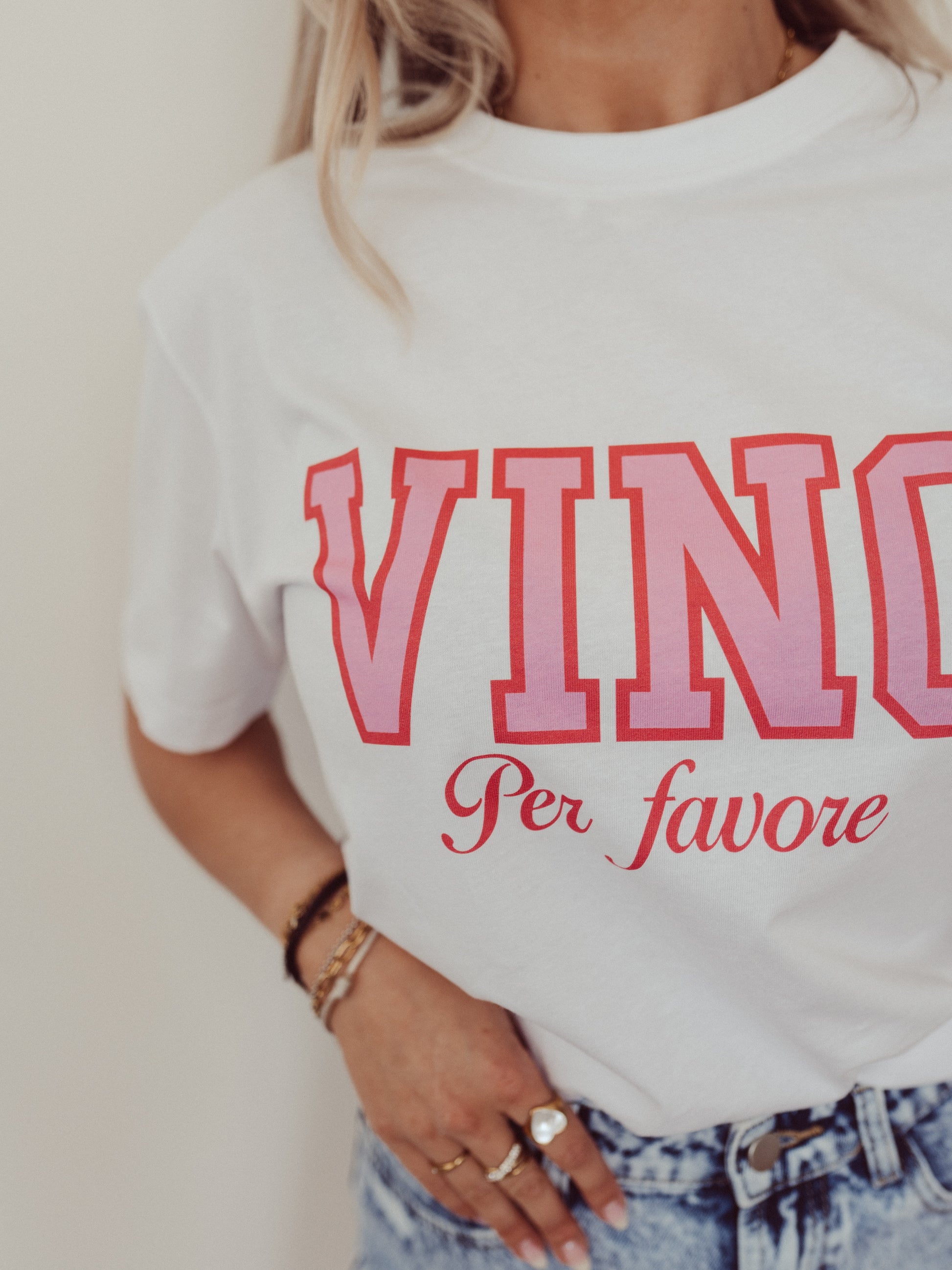 Loose fit shirt van ons eigen label She. Met de tekst: Vino per favore. Dit shirt is een echte musthave voor deze zomer!