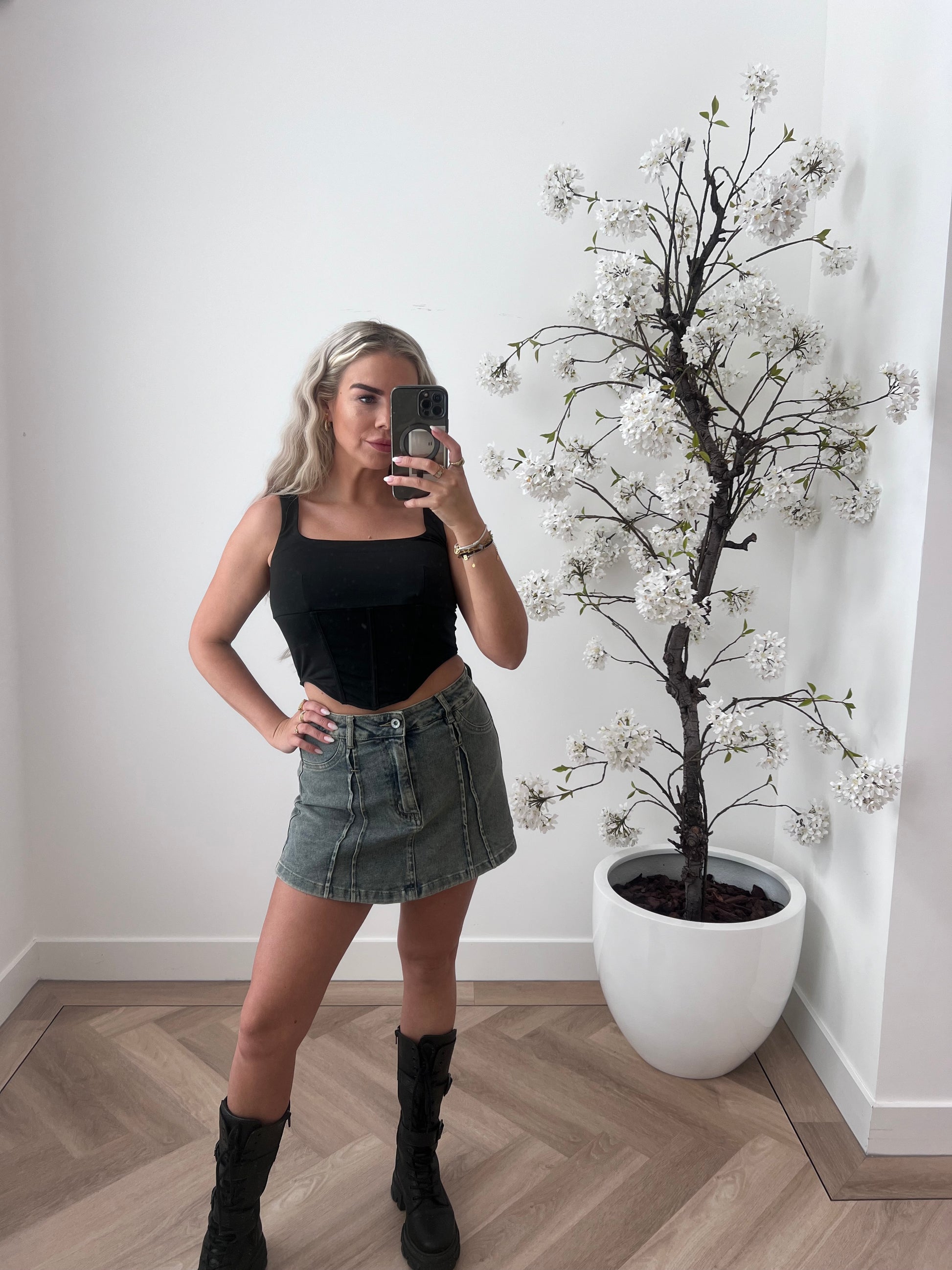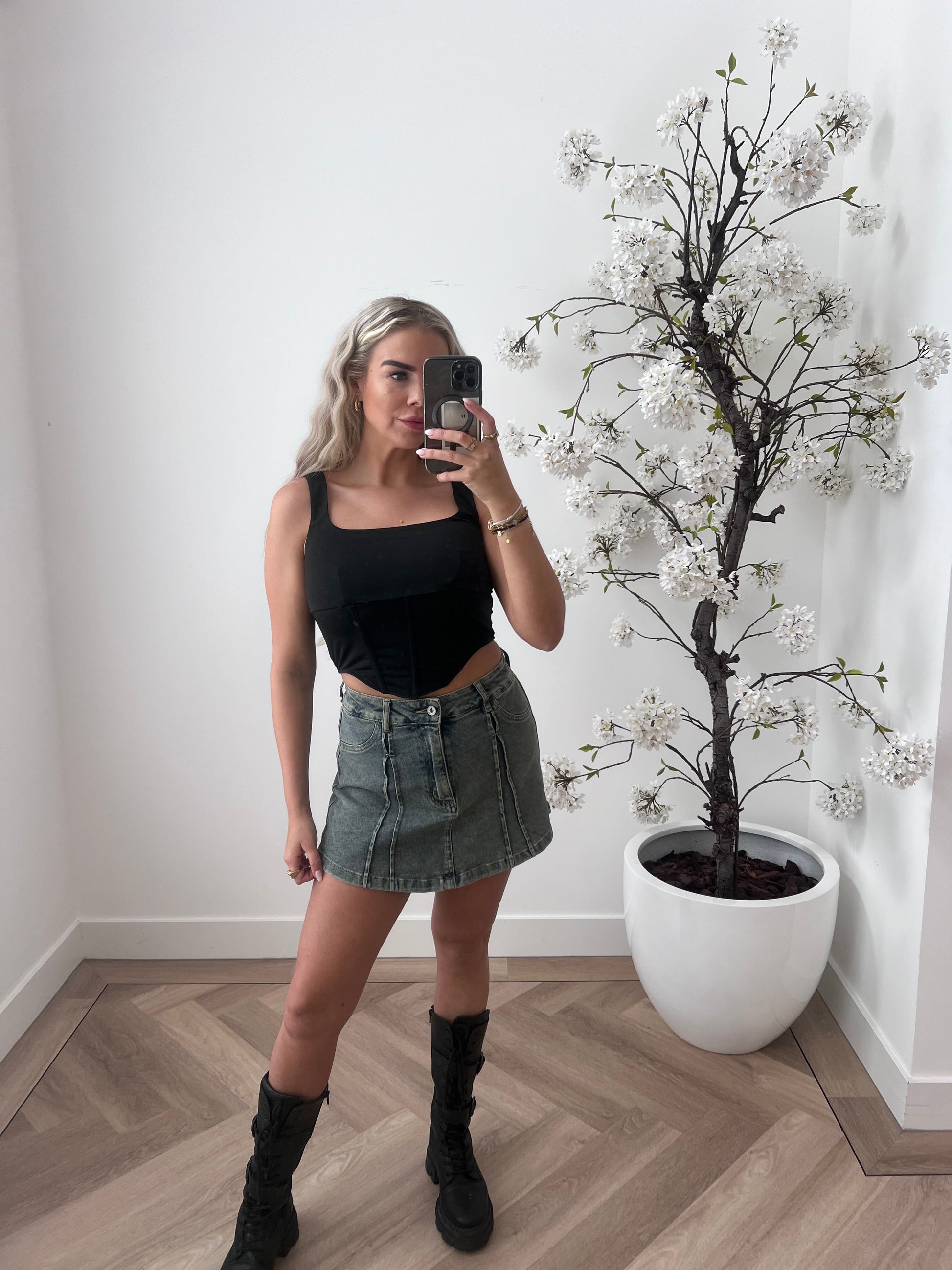 Hoe gaaf is dit denim skater skortje? Het lijkt van de voorkant een rokje, maar het is een skort!Dit skortje bevat stretch en is perfect voor het festivalseizoen. Combineer het met een van onze body's voor een complete look.