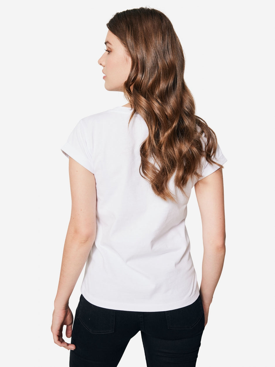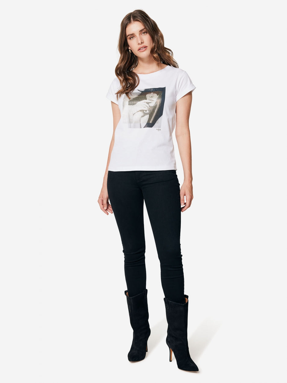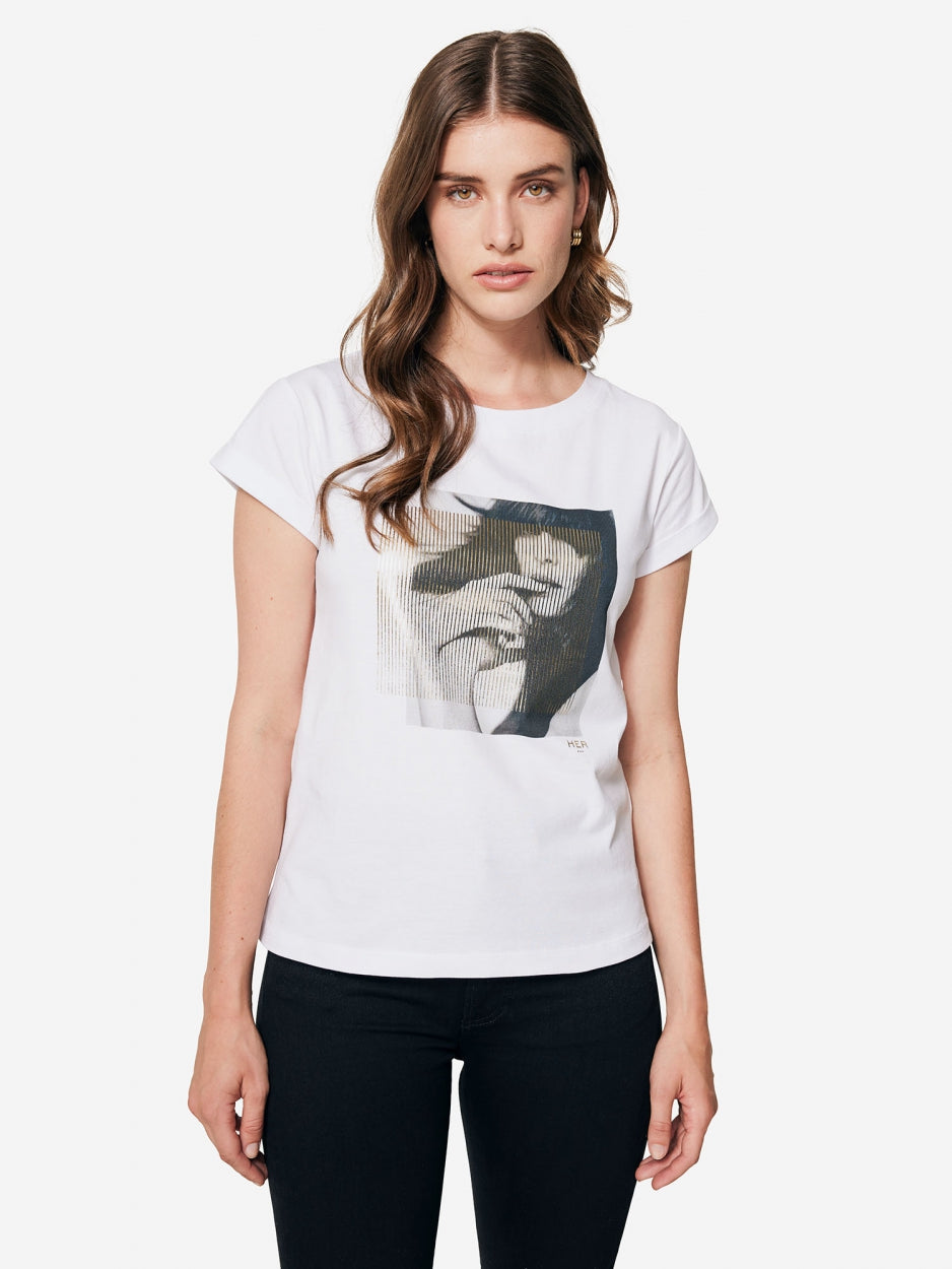 Dit stoere T-shirt heeft een fotoprint met metallic gouden lijnen. Het T-shirt heeft korte mouwen met een omslag.